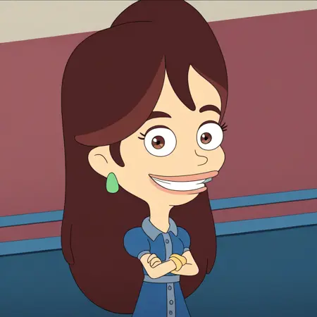 1girl, Solo, Devin_BM, light skin, brown eyes, reddish brown hair, reddish brown eyebrows, long hair, green oval-shaped earrings, golden bracelets, golden ring, blue denim dress with buttons, brown lace-up ankle boots, big eyes, medium stature