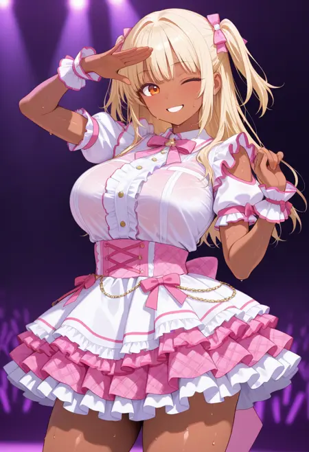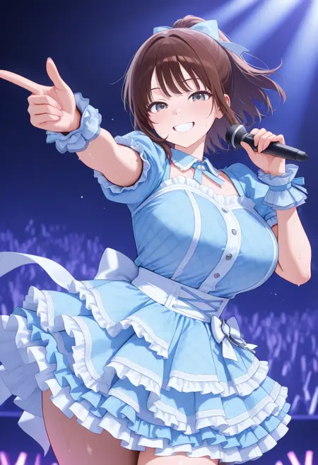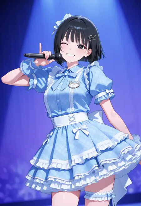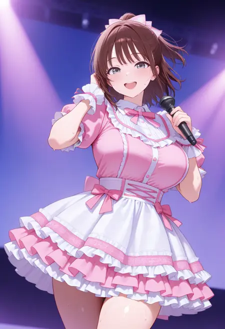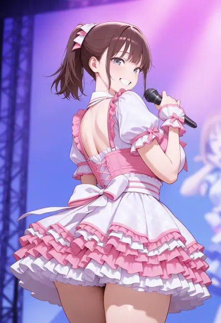 提示词 "idol outfit" 可在大多数基础模型中生成偶像风格的服装,但使用此LoRA有助于更稳定地生成可爱、带褶边的偶像服装。大概吧。