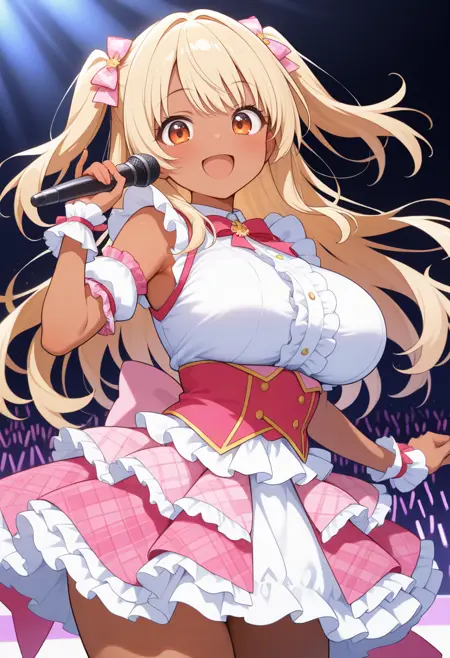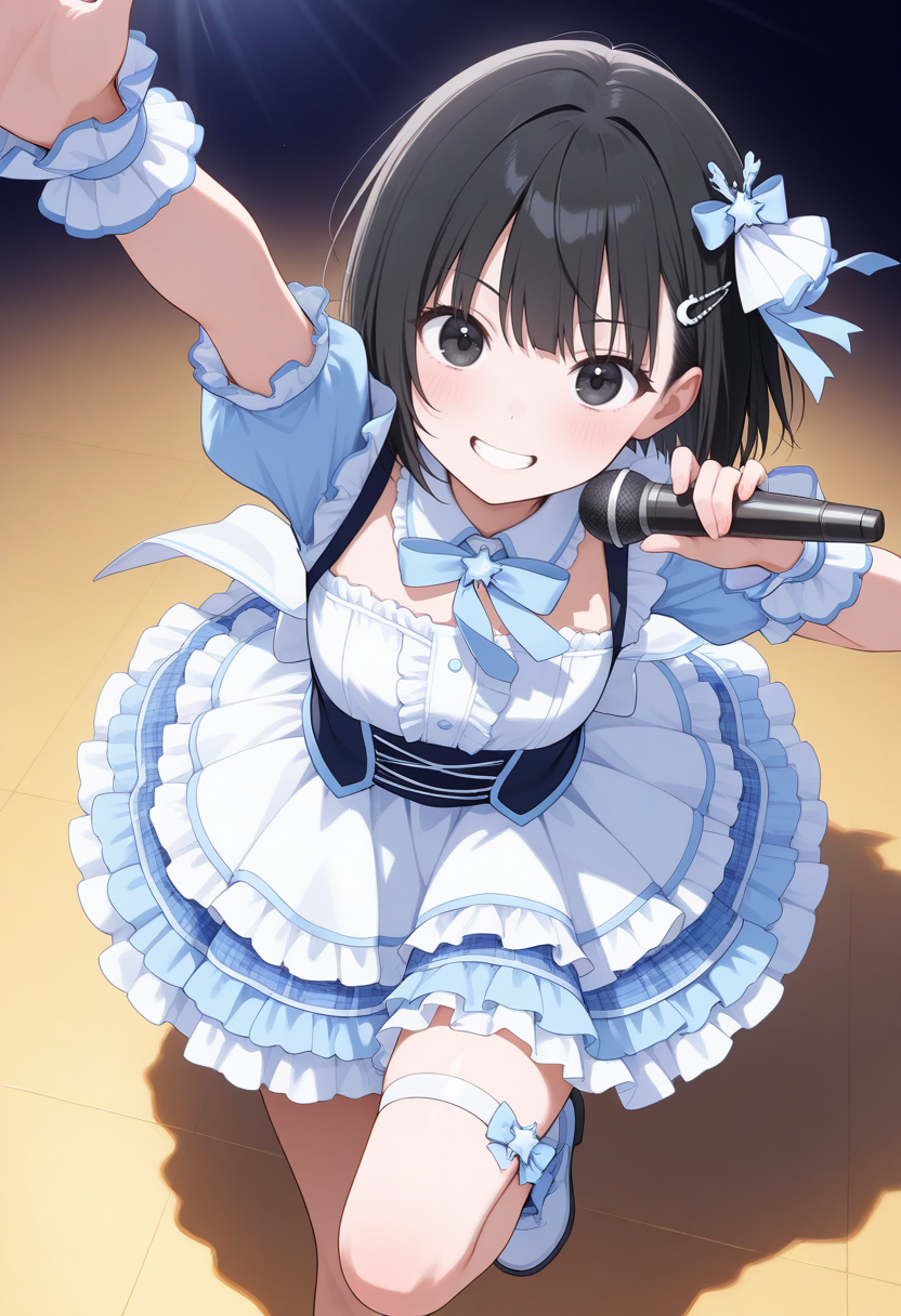提示词 "idol outfit" 可在大多数基础模型中生成偶像风格的服装,但使用此LoRA有助于更稳定地生成可爱、带褶边的偶像服装。大概吧。