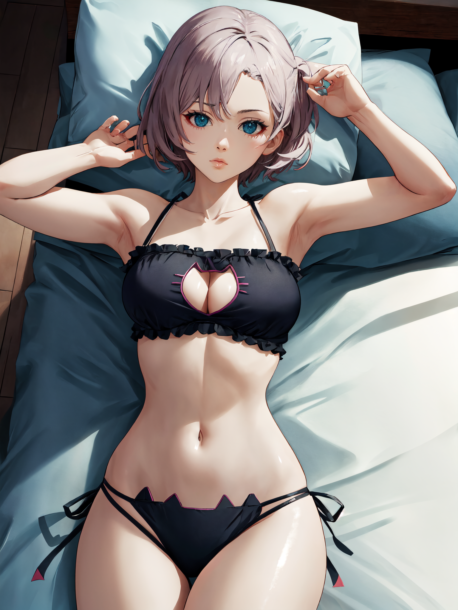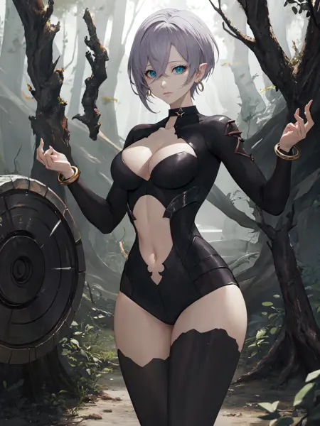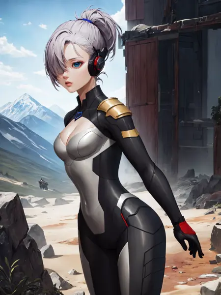 テックスーツ: 「ポニーテール、片目を覆う髪、胸元、胸元のカットアウト、グレーのボディスーツ、アーマー、SF、肌にぴったり、肩アーマー」