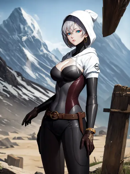 フーディ + ボディスーツ: 「短髪、ショルダーブレス(衣装)、白いフード、フードをかぶっている、白いフーディ、短めのフーディ、白い袖、ふくらんだ袖、イヤリング、胸元、ベルト、黒い手袋、片方のズボンの脚、大きな胸、黒いボディスーツ、非対称な脚部の装い」