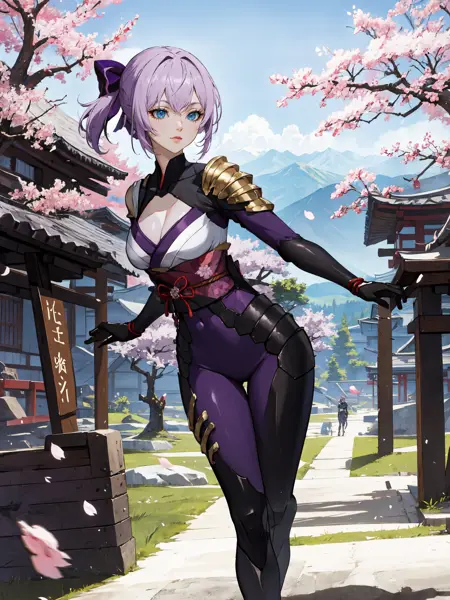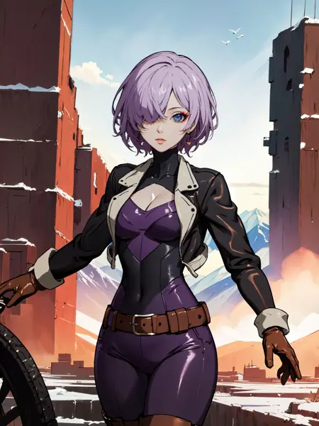 ジャケット + ボディスーツ: 「短髪、片目を覆う髪、胸元、胸元のカットアウト、手袋、開いたジャケット、短めのジャケット、レザー・ジャケット、黒いジャケット、紫色のボディスーツ、ベルト、ブーツ」