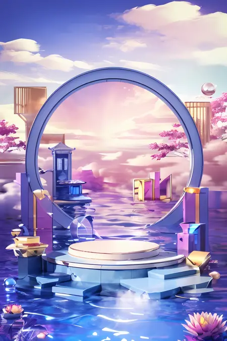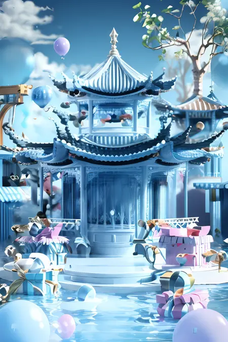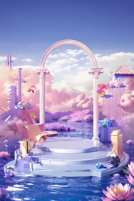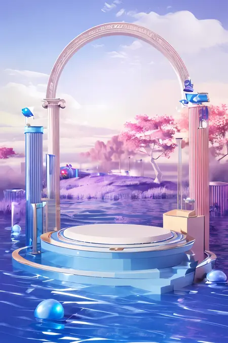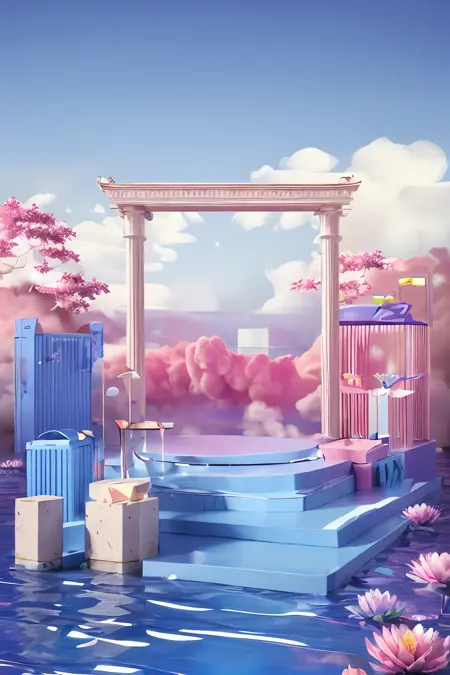 일반적인 프롬프트 단어: CGgame buildingC4D nsw, sky, scenery, no humans, cloud, tree, outdoors, bubble, cherry blossoms, water, reflection, day, blue sky, grass, plant, C4D, stage, 3d render, east asian architecture, reflection, building, pillar, column, landscape, arch, C4D, Pattern stone carving,