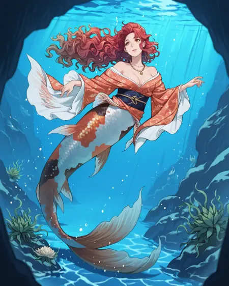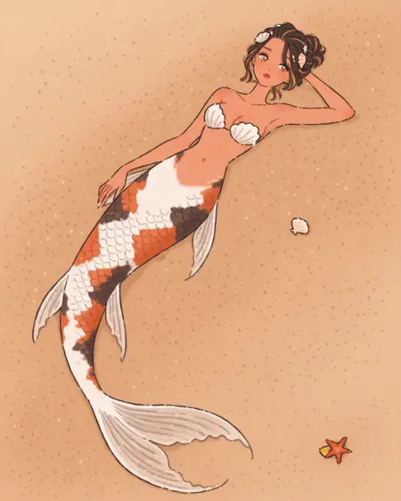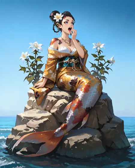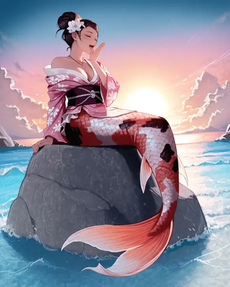 Depending on what pose you're attempting, you may need to put "legs" in negatives, but as long as you've got "mermaid" in positives it's honestly not usually necessary. It's trained on a black/white/orange koi fish pattern, but sometimes gets fussy and ignores the black. If you want to nudge it to add the black back in without making random other stuff black, "calico pattern" in positives at about 0.8 strength works wonders. Throw "cat" in negatives if you do that, though.
