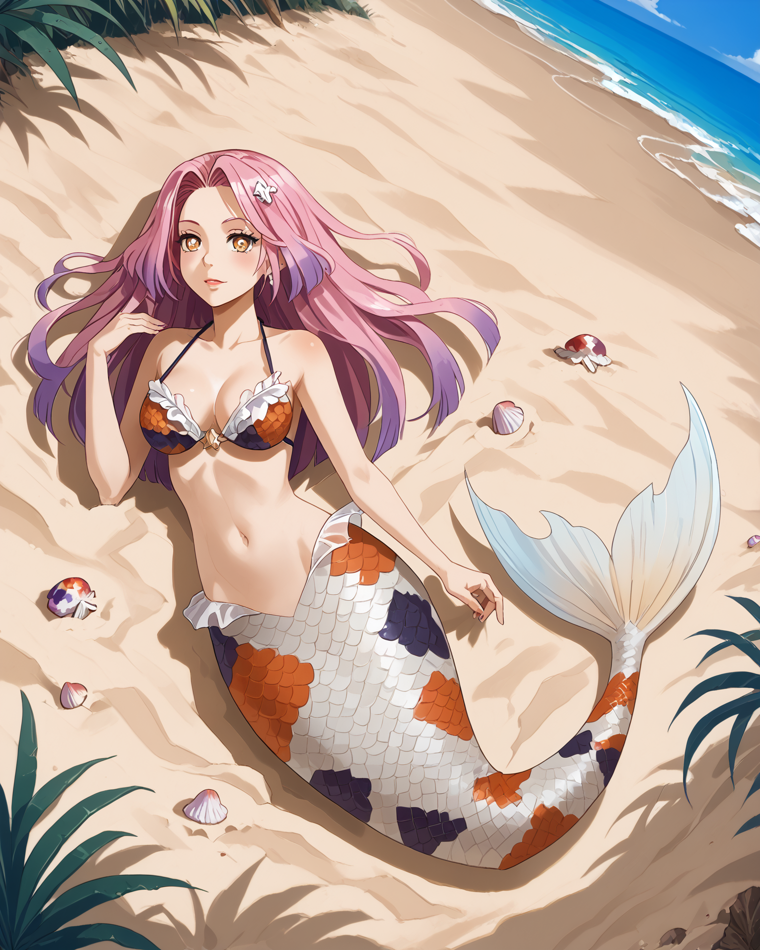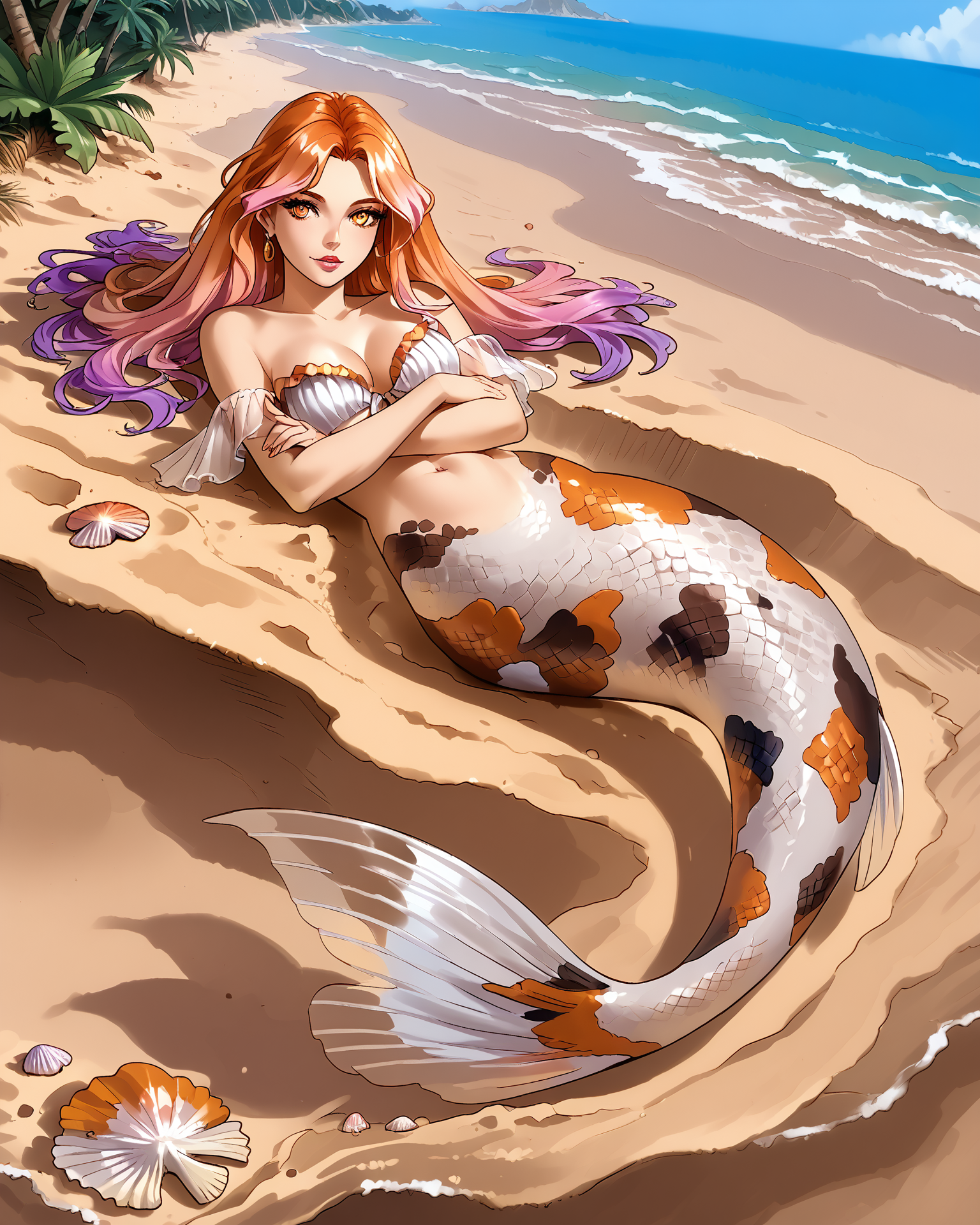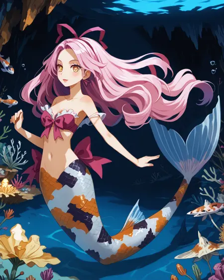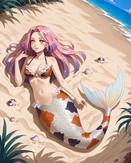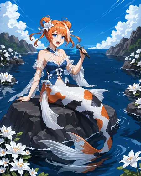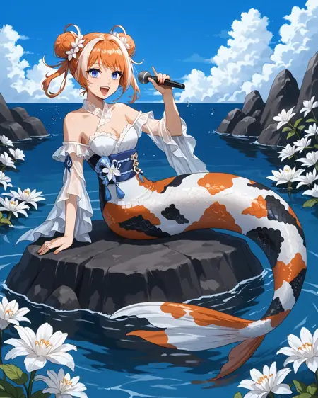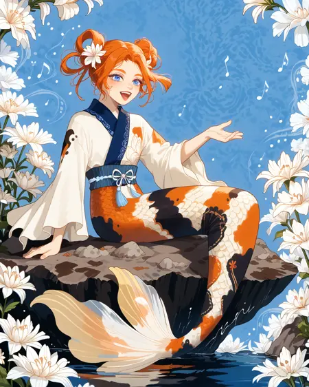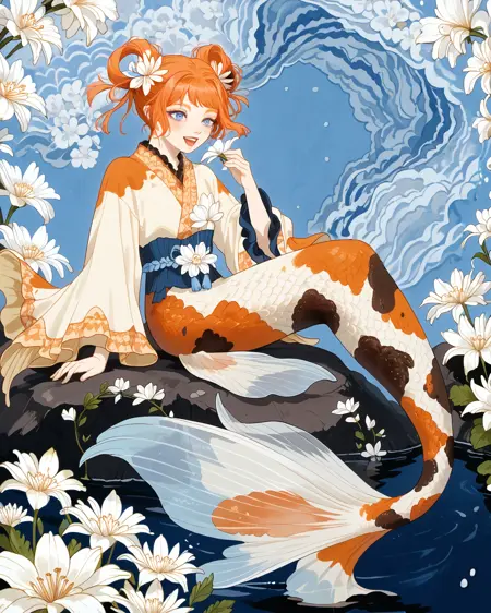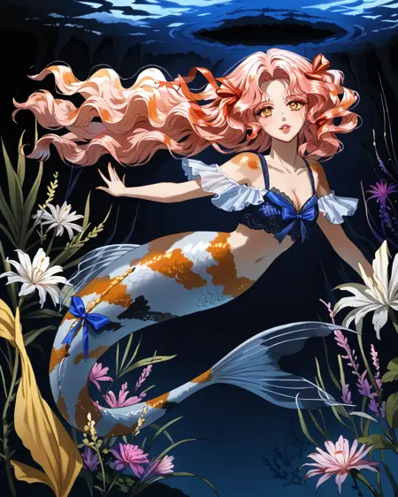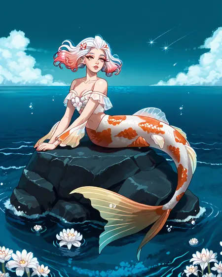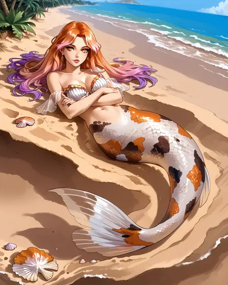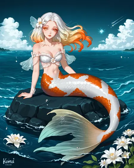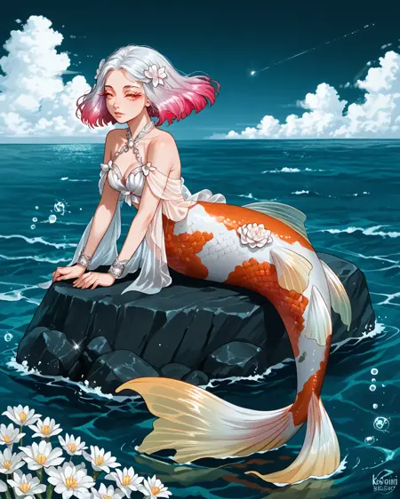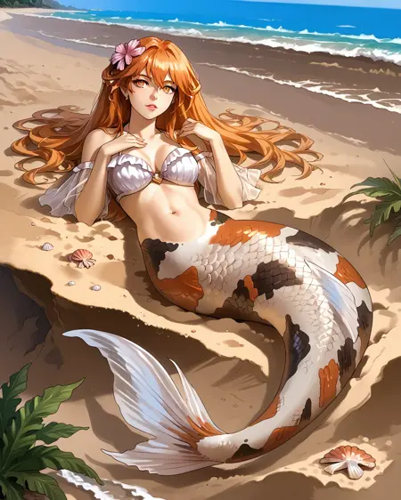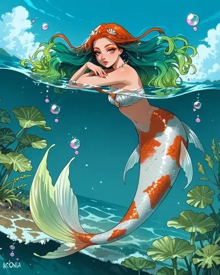 Depending on what pose you're attempting, you may need to put "legs" in negatives, but as long as you've got "mermaid" in positives it's honestly not usually necessary. It's trained on a black/white/orange koi fish pattern, but sometimes gets fussy and ignores the black. If you want to nudge it to add the black back in without making random other stuff black, "calico pattern" in positives at about 0.8 strength works wonders. Throw "cat" in negatives if you do that, though.