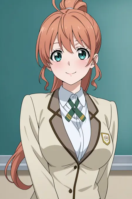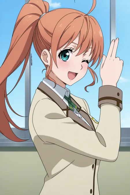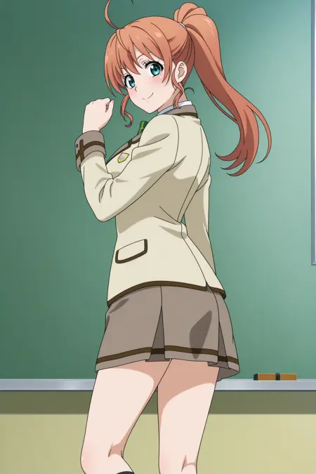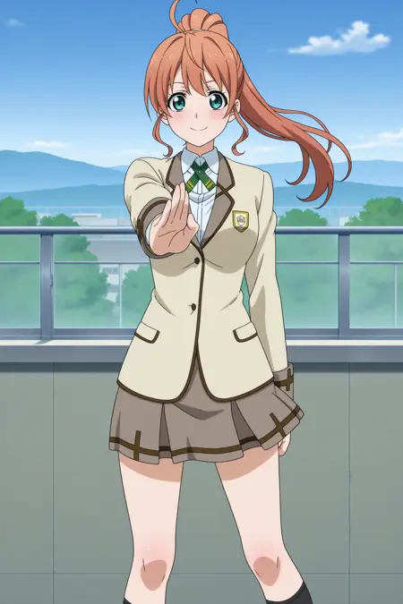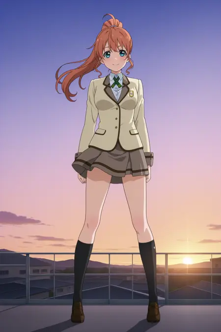 yamabuki hinata, long hair, orange hair, ponytail, white hair tie, sidelocks, ahoge, wispy bangs, aqua eyes, school uniform, yellow jacket, white shirt, collared shirt, green neck ribbon, grey skirt, pleated skirt, black socks, kneehighs, loafers