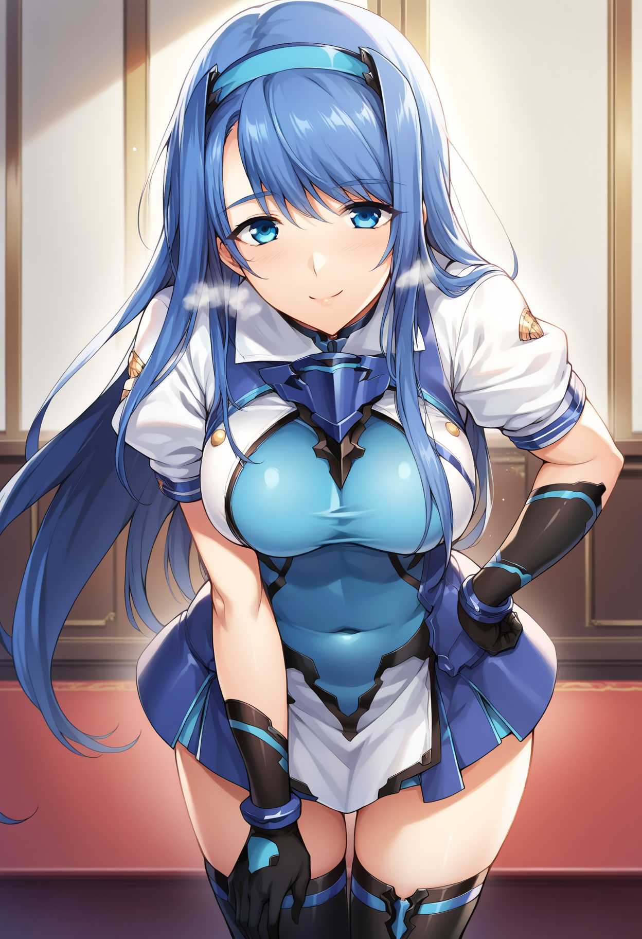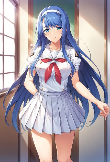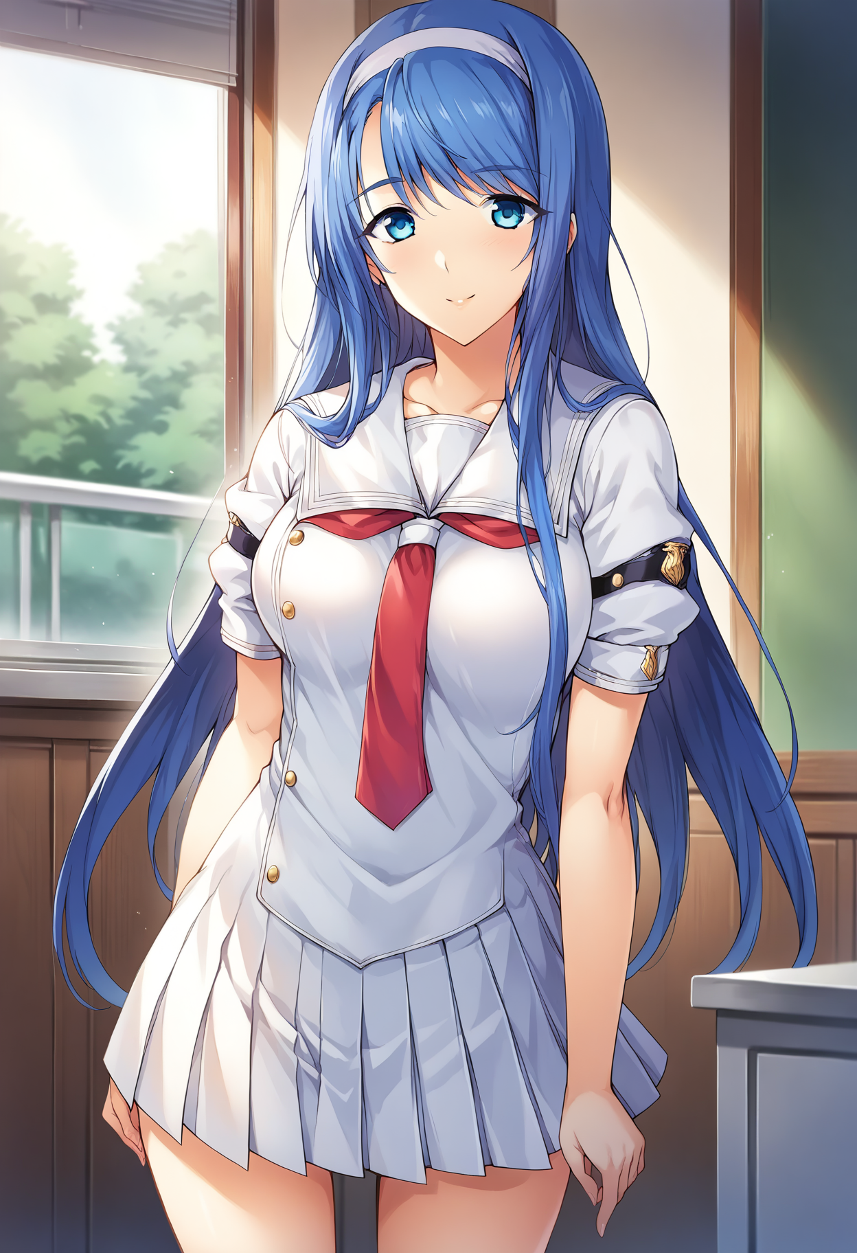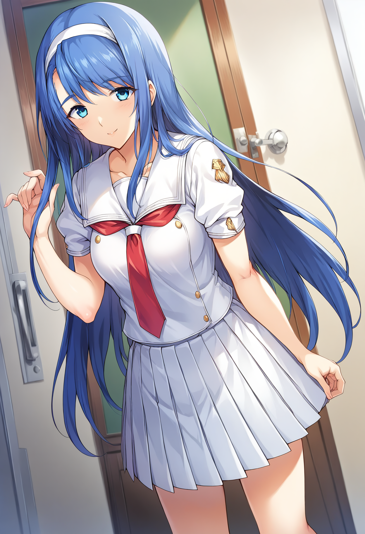 score_9, score_8_up, score_7_up, score_6_up, score_5_up, score_4_up, masterpiece, source_anime, 1girl, c-xillia, blue hair, blue eyes, very long hair, white hairband, white sailor shirt, white pleated skirt, red neckerchief, looking at viewer, indoors, depth of field, dutch angle, smile,