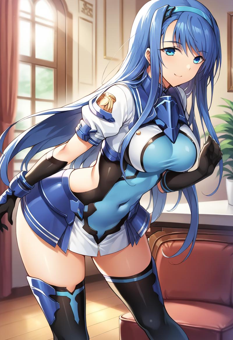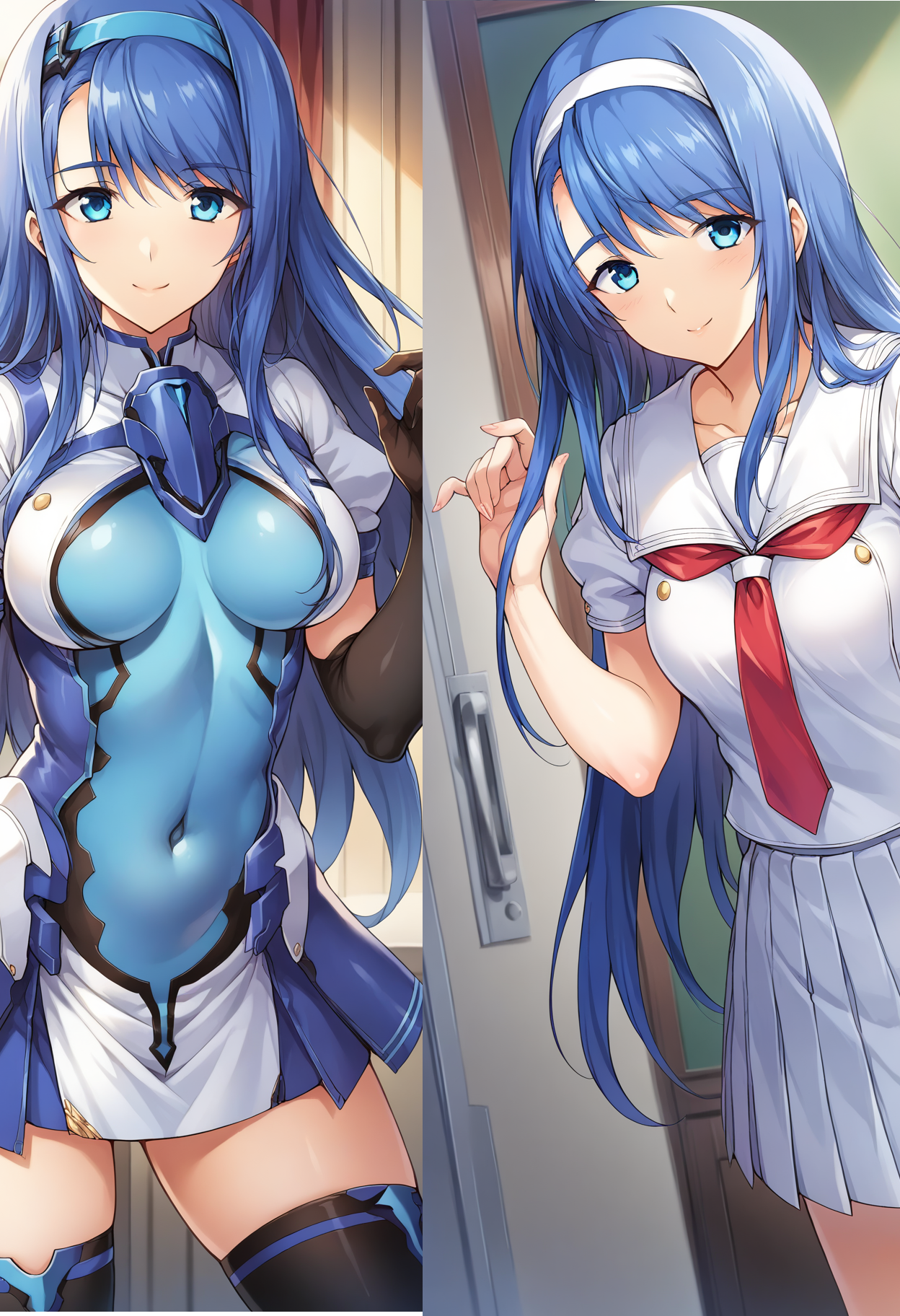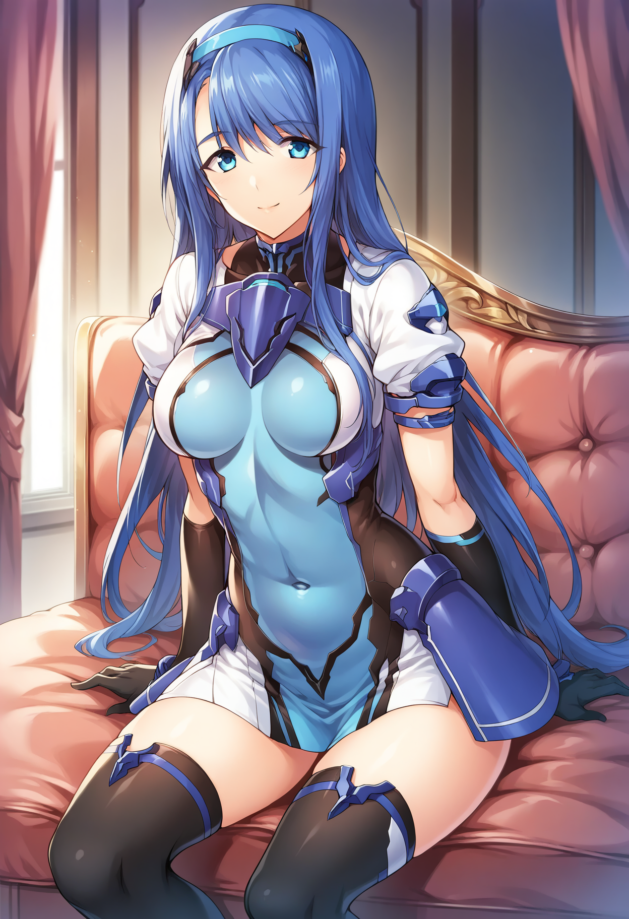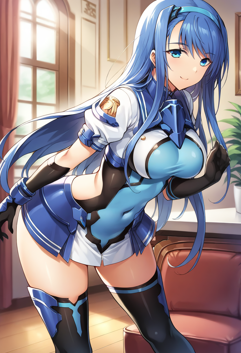 score_9, score_8_up, score_7_up, score_6_up, score_5_up, score_4_up, masterpiece, source_anime, 1girl, c-xillia, blue hair, blue eyes, very long hair, white hairband, white sailor shirt, white pleated skirt, red neckerchief, looking at viewer, indoors, depth of field, dutch angle, smile,
