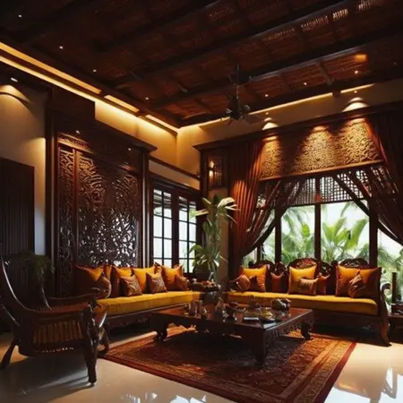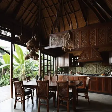 Furniture is typically substantial and ornately carved, while decor often includes traditional masks, sculptures, and textile arts. Intricate wooden details and tropical plants further enhance the aesthetic.