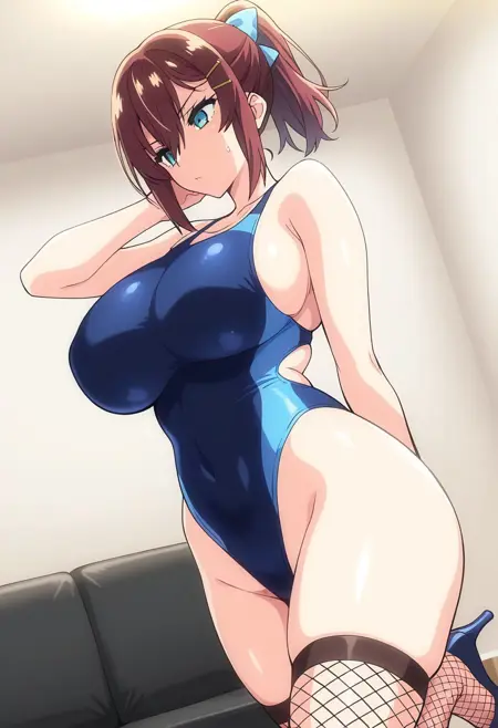 马尾,发饰,发带,泳装,蓝色连体泳衣,过膝长筒袜,网眼过膝袜,高开叉,高跟鞋