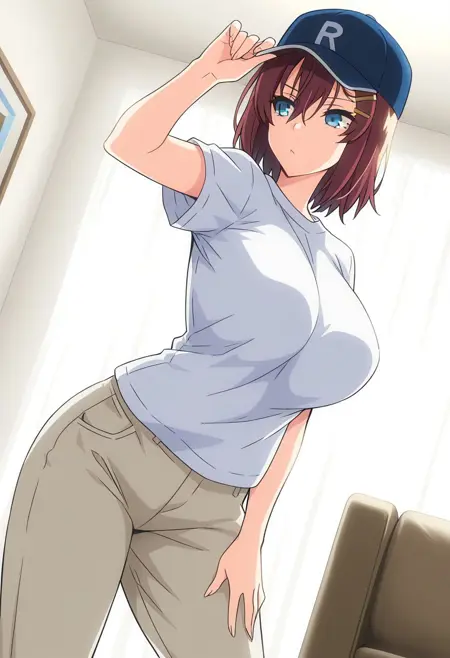 七尾亚花音: 1girl,akane nanao,large breasts,blue eyes,brown hair,red hair,hair between eyes,short hair,hair ornament,hairclip