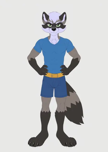 rave_raccoon, raccoon, grey fur, short hair, white hair, 1boy, male focus, green eyes, athletic, blue shirt, blue shorts