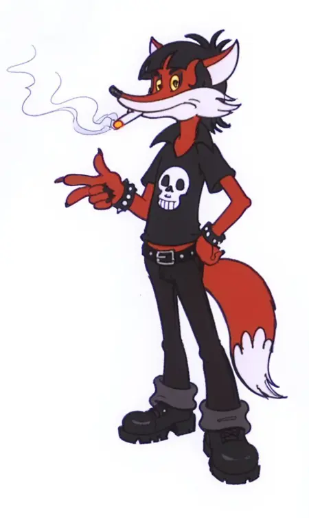 lis_stilyaga, fox, male focus, 1boy, blonde hair, yellow sclera, red fur, red hands, fangs, clothed, blue shirt, tight shirt, black pants, black belt, black footwear,