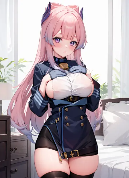 새로운 트리거 단어: sideless tented shirt, ako uniform, blue jacket, long sleeves, black gloves, cowbell, neck bell