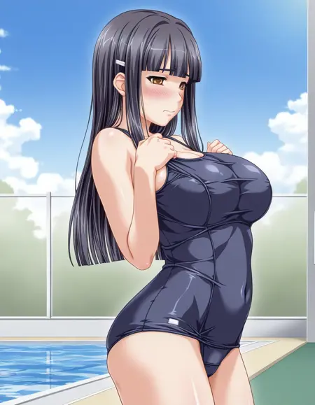 ebihara urara, black hair, long hair, blunt bangs, brown eyes, big breasts, white dress, long dress, short sleeves, cleavage, white collared shirt, black belt