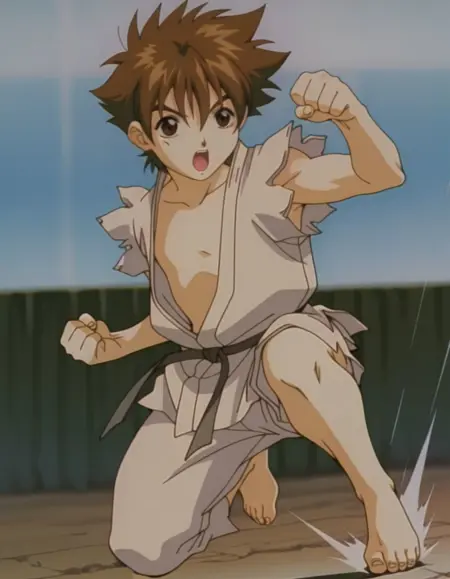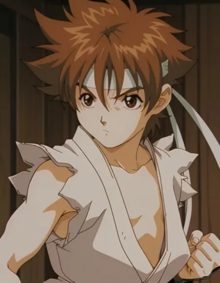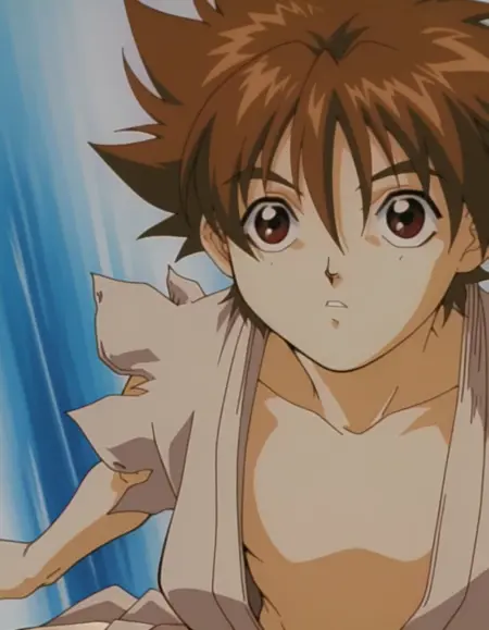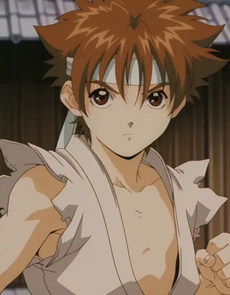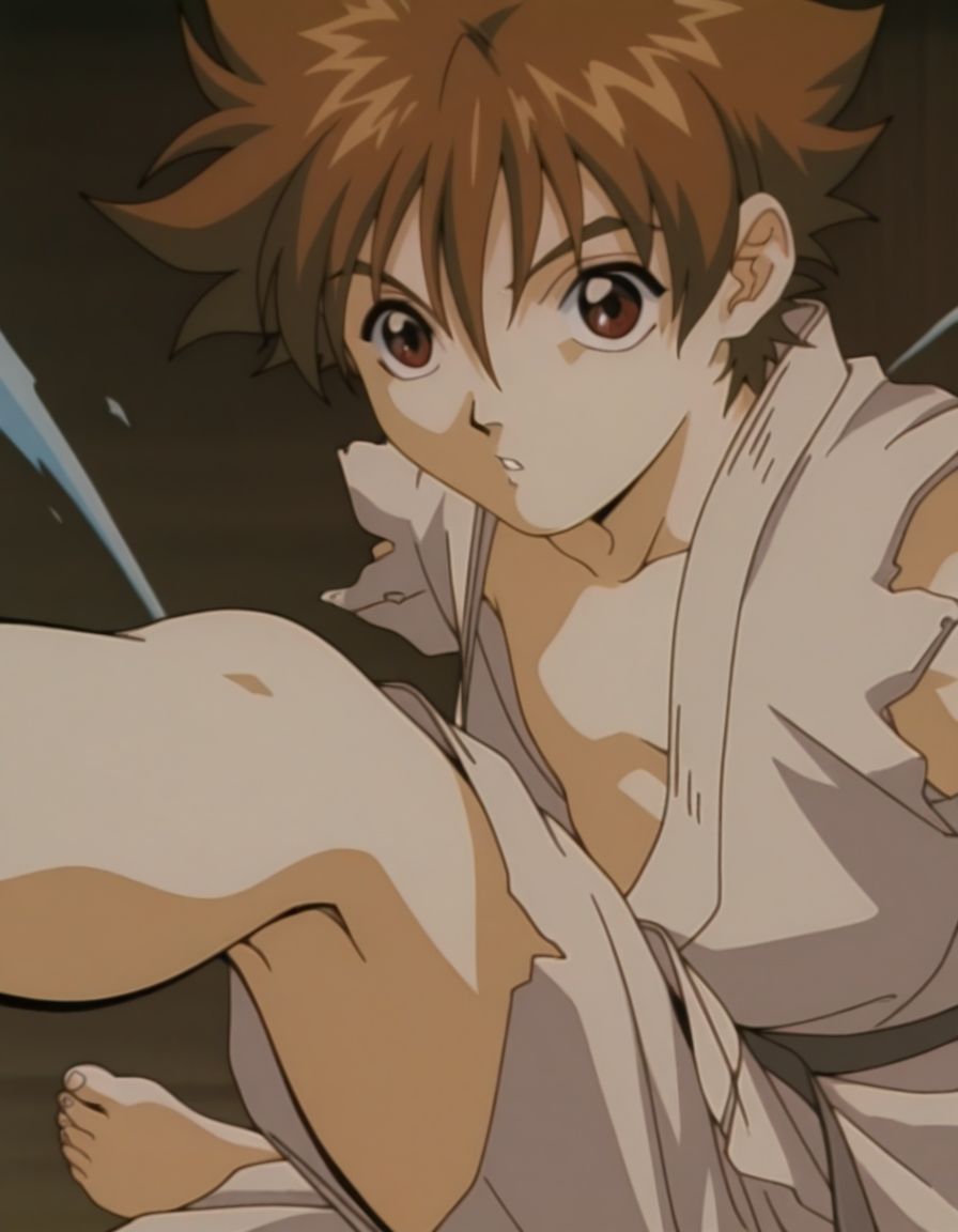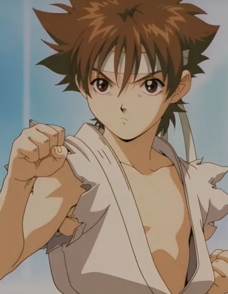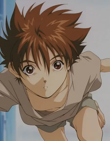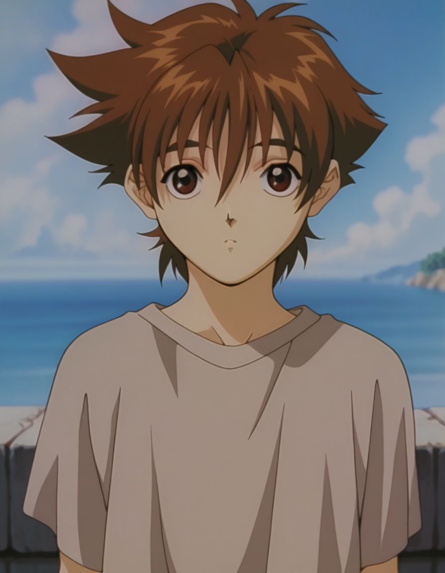 sh0n, 1990s \(style\), brown hair, short hair, hair between eyes, anime coloring, brown eyes