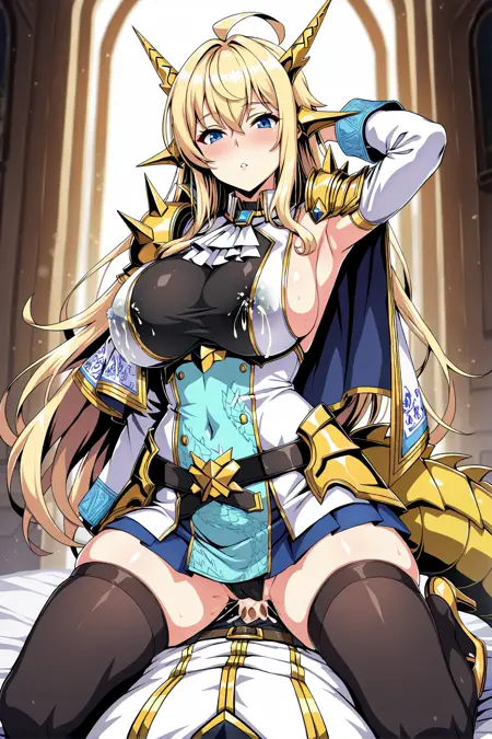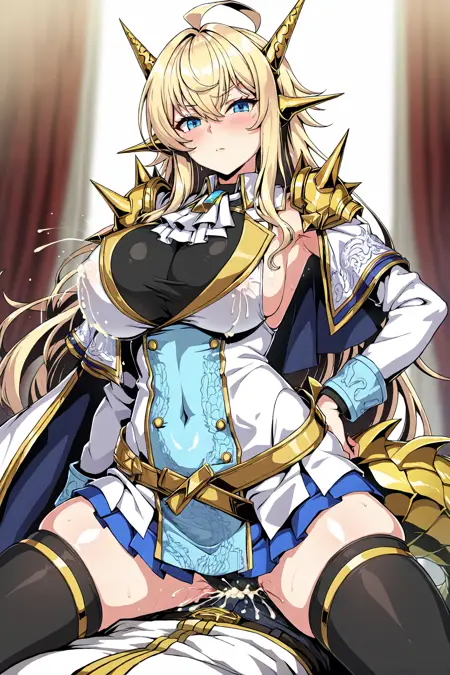 아호게, 사이드락, 파란 눈, 긴 머리, 매우 긴 머리, 금발, 눈 사이의 머리카락, 금색 뿔,