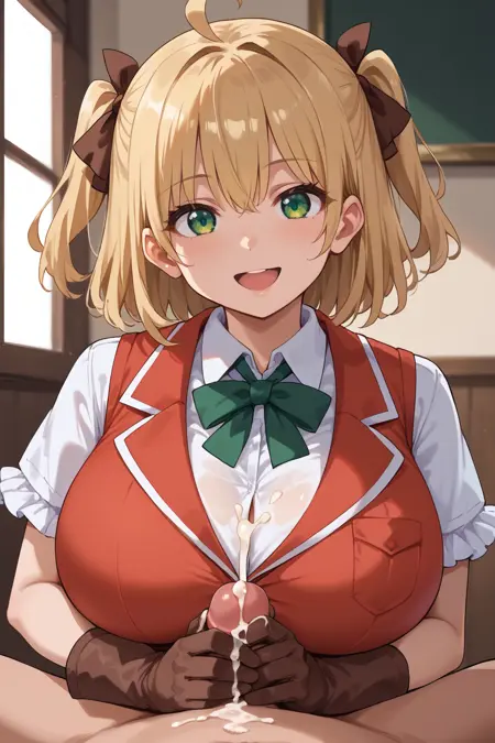 eruru6135, ahoge, blonde hair, green eyes, medium hair, two side up, hair bow, brown bow,