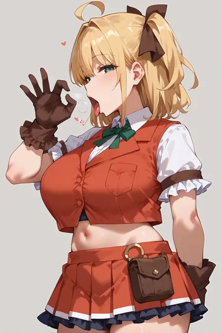 red skirt, microskirt, pleated skirt, frilled skirt, ass visible through thighs, heart-shaped buckle,