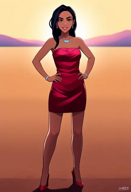 来自《Road 96》的索尼娅。主提示词为“SonyaR96”,并附带“长发、黑发、深肤色女性、棕色眼睛”。她的服装为“连衣裙、无肩带、珠宝”。