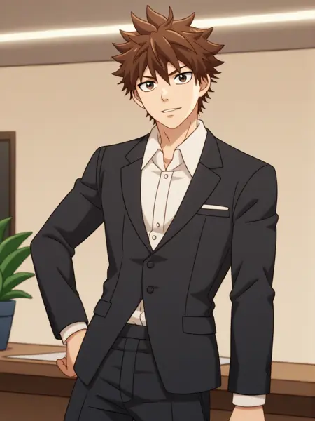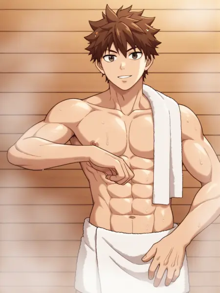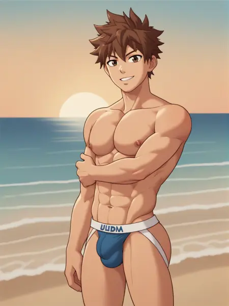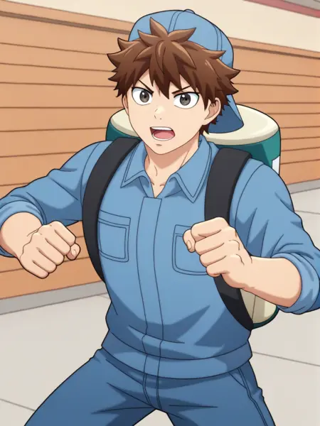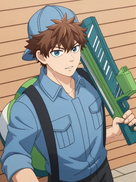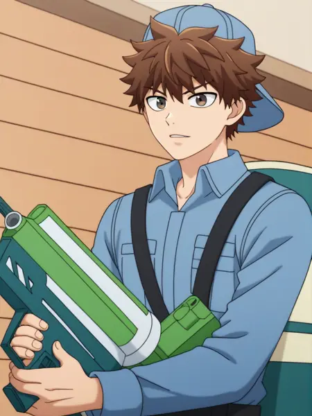 트리거 단어: b_cell, 1boy, 야구 모자, 파란 셔츠, 갈색 머리, 장갑, 모자, 물총, 탱크 들고 있음