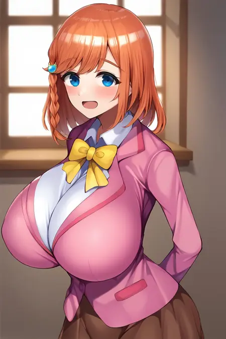 服装:粉色西装外套,有领衬衫,长袖,过膝袜,白色袜子,棕色裙子,粉色夹克,白衬衫,黄色蝴蝶结,黄色领结