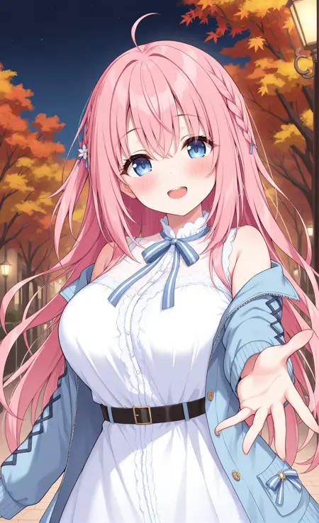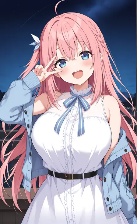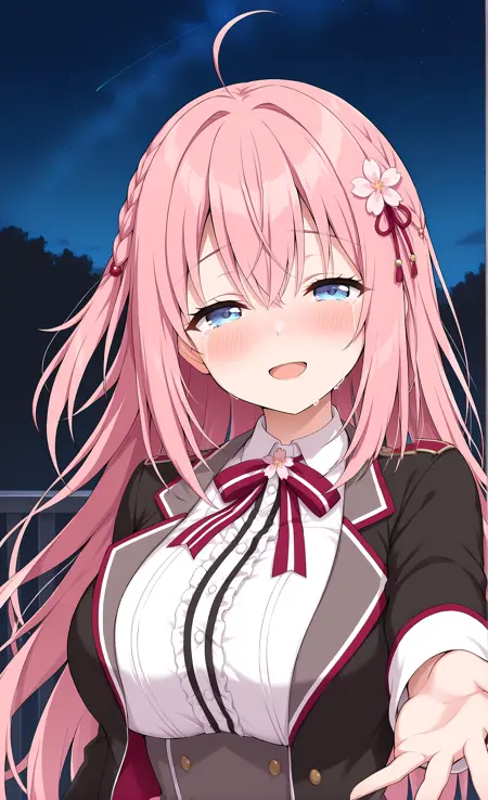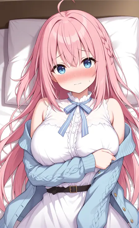 Base: Maaya,pink hair,blue eyes,long hair,ahoge,bangs,hair between eyes\