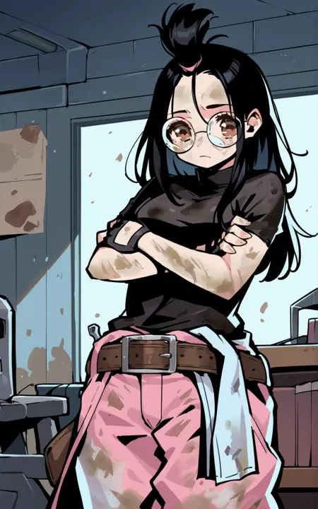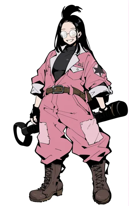 Reinforcement Tags: topknot, glasses, round eyewear, black hair, long hair, white glasses OR brown eyesFor her Outfit:** jumpsuit, pink jumpsuit, combat boots, boots, gloves, fingerless gloves, belt, black shirt