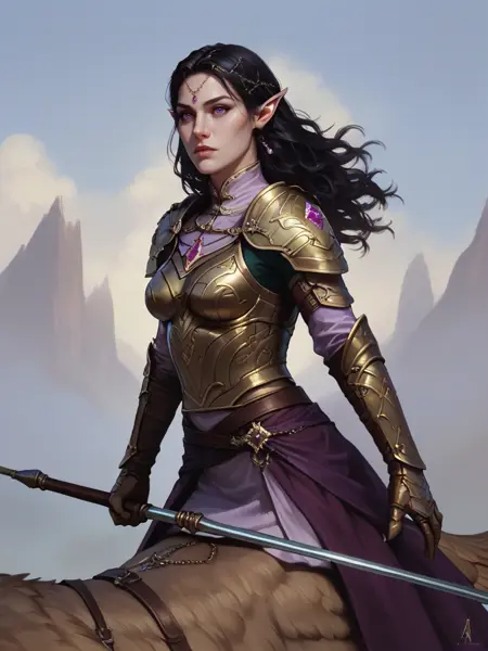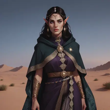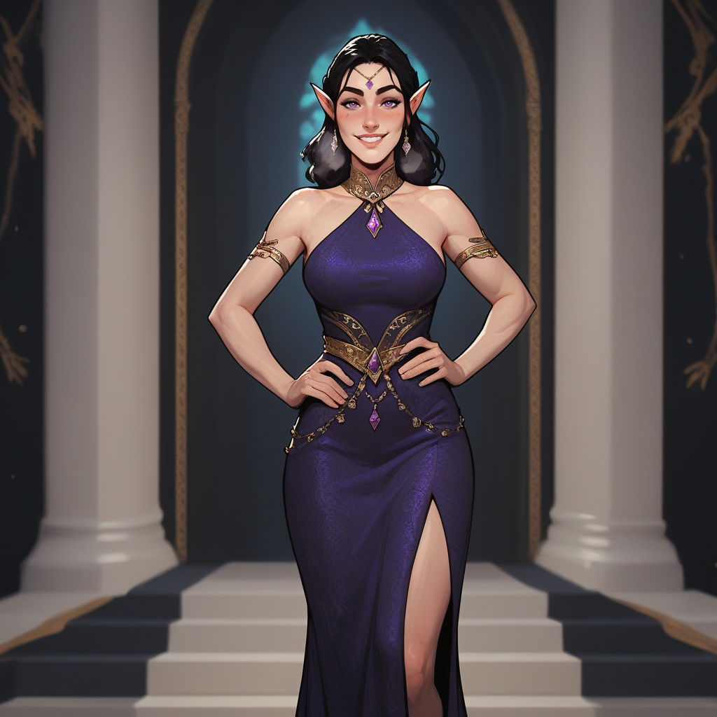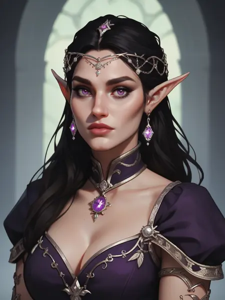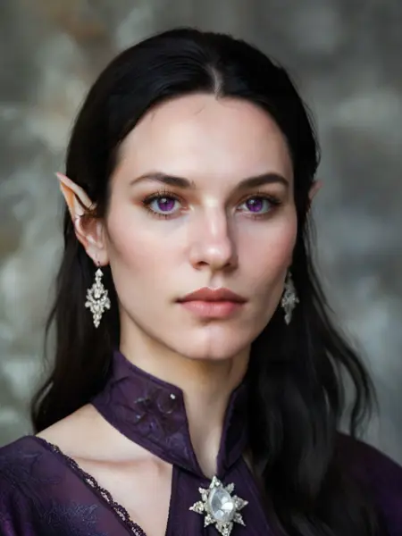 alhana, purple eyes, dark hair, elf, pointed ears, pale skin, jewelry, dress, starjewel