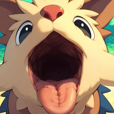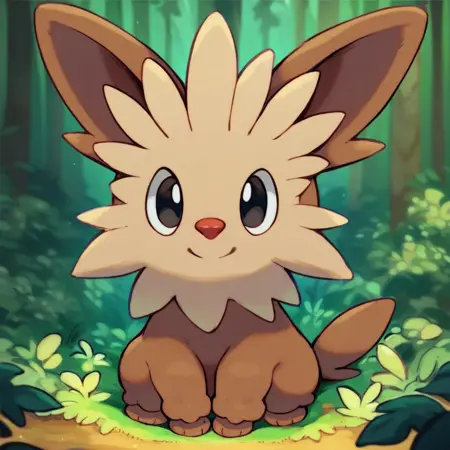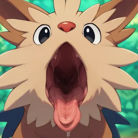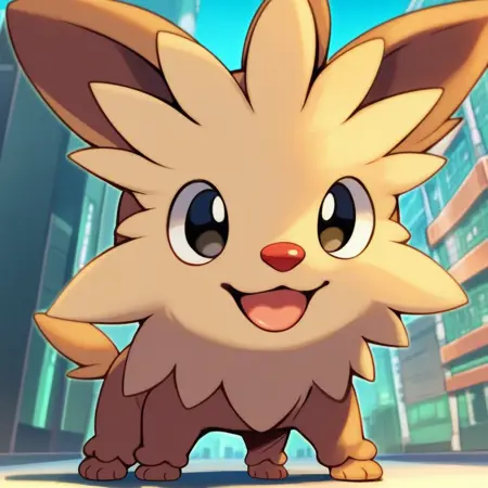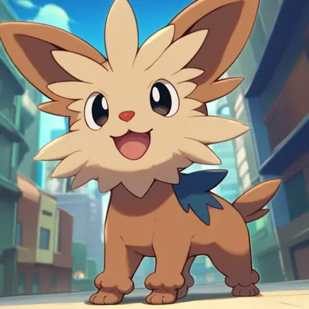 Pokemon, brown fur, dark blue back, tan face fur, red nose, black eyes,