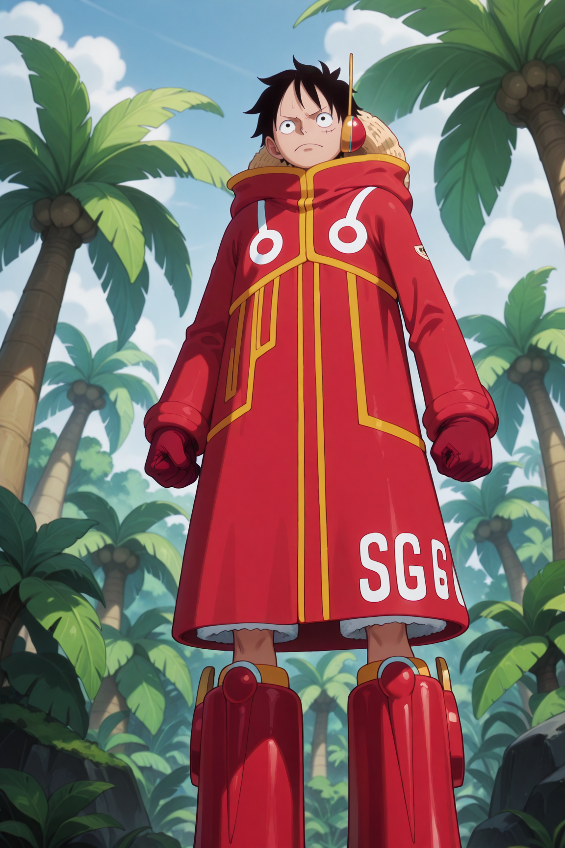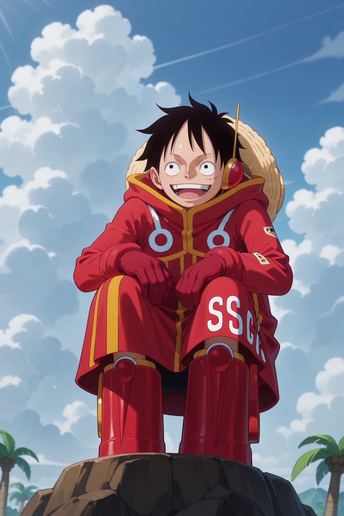 luffy_eh、黒い髪、黒い目、顔の傷跡、赤いフード付きコート、赤い手袋、わら帽子、赤いブーツ、ヘッドフォン