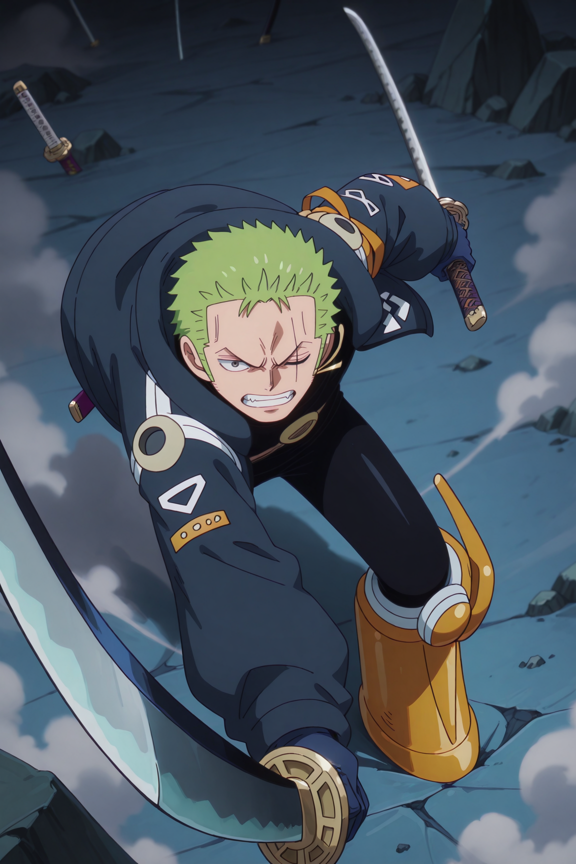 zoro_eh、緑の髪、灰色の目、傷跡、黒のボディスーツ、ジャケット、青い手袋、黄色の靴