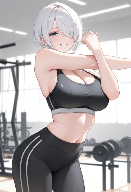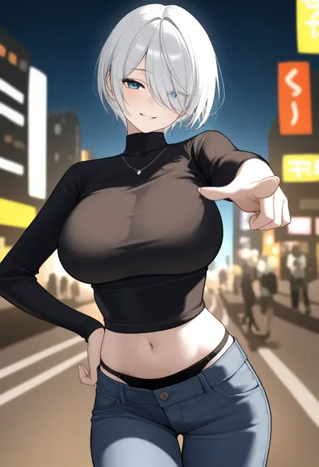 "ANG41KOF, 白发, 短发, 发丝遮住一只眼睛, 蓝眼, 短款夹克, 露胸, 袖子卷起, 无指手套, 马裤, 黑色内裤"