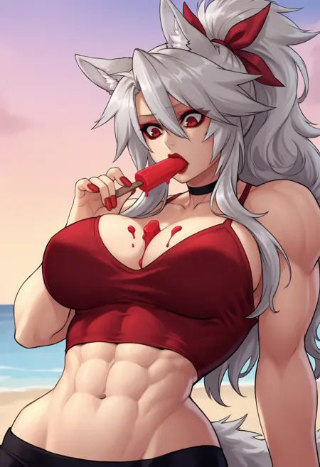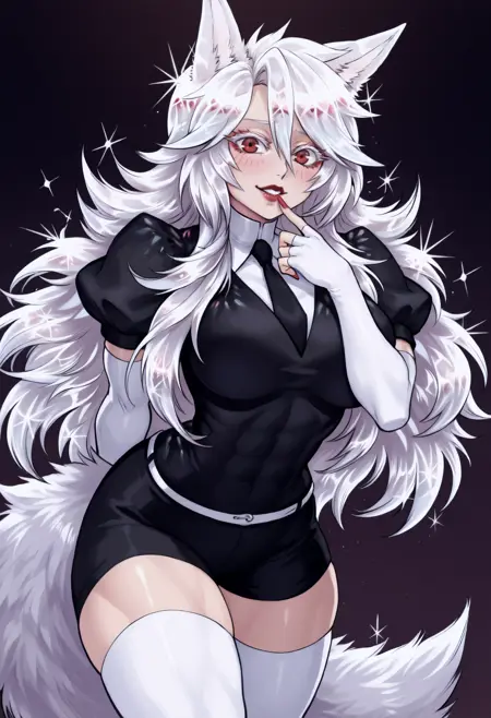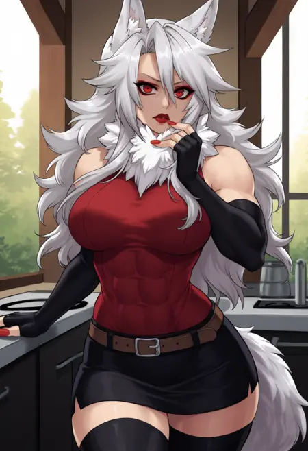 "狼女,红眼睛,动物耳朵,妆容,眼线,口红,狼尾,长发,头发遮住眼睛,银发,大胸部,肌肉女性" —— 为确保准确性,必须包含这些关键词。
