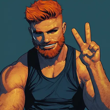 推荐触发词:橙色头发、胡子、面部毛发、胡须、短发、背心、肌肉发达、 bara、胸肌