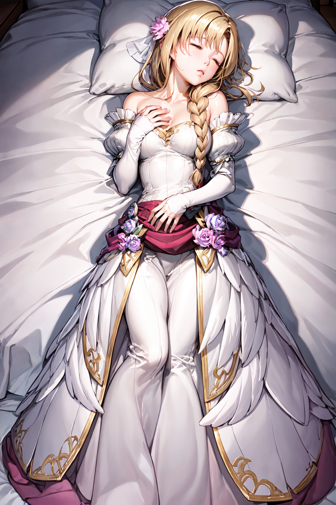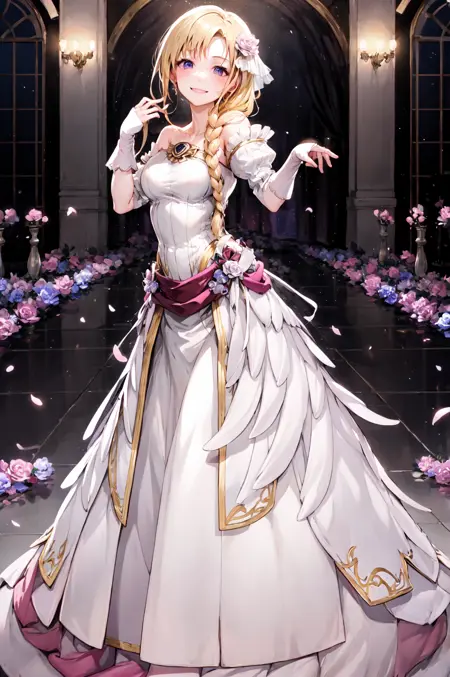 【wedding outfit Prompt】: wed_louise, white glove, dress, brooch, flower, white dress, long dress, wedding dress, bare shoulders, single braid, bridal gauntlets, strapless dress, hair over shoulder, strapless