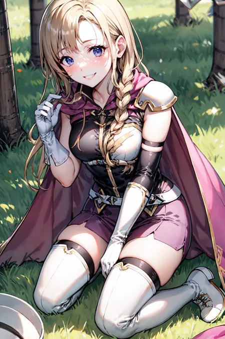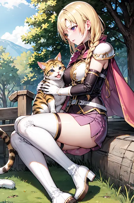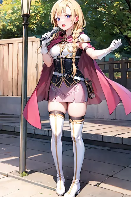 【default outfit Prompt】: def_louise, blonde hair,zettai ryouiki, gloves, boots, cape,thigh boots, elbow gloves,white footwear, shoulder armor,belt, skirt, asymmetrical gloves, short dress, breastplate, white gloves, dress