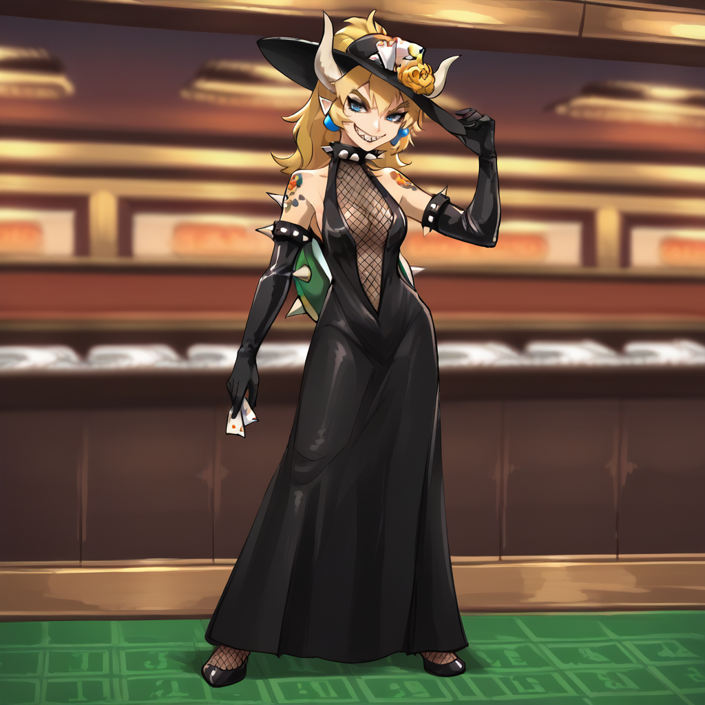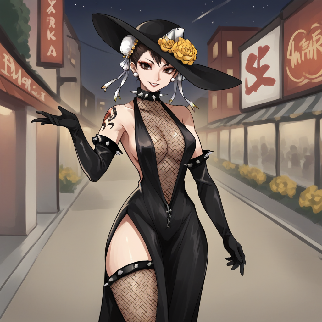 オプション:黒いドレス、フィッシュネット、肘までガーブ、帽子の花、黒い手袋、化粧、スパイクカラー、タトゥー