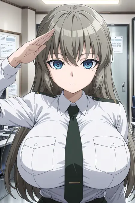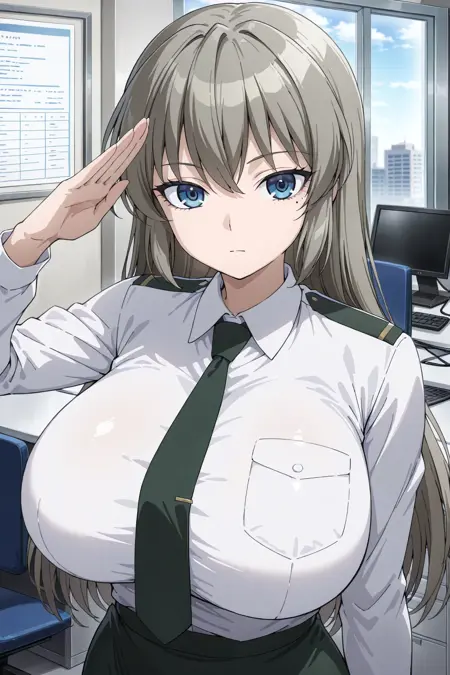 군복, 녹색 스커트, 연필 스커트, 흰색 셔츠, 칼라 셔츠, 녹색 넥타이