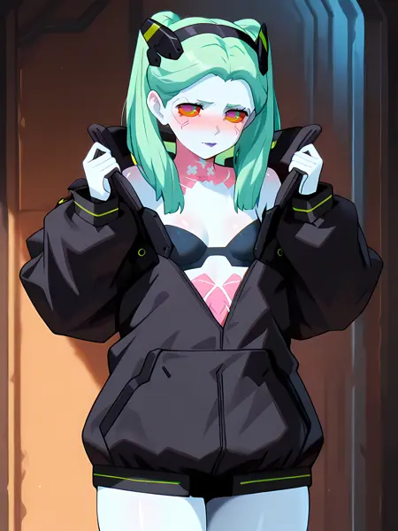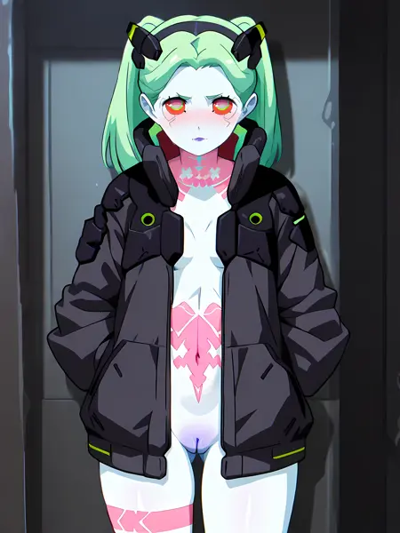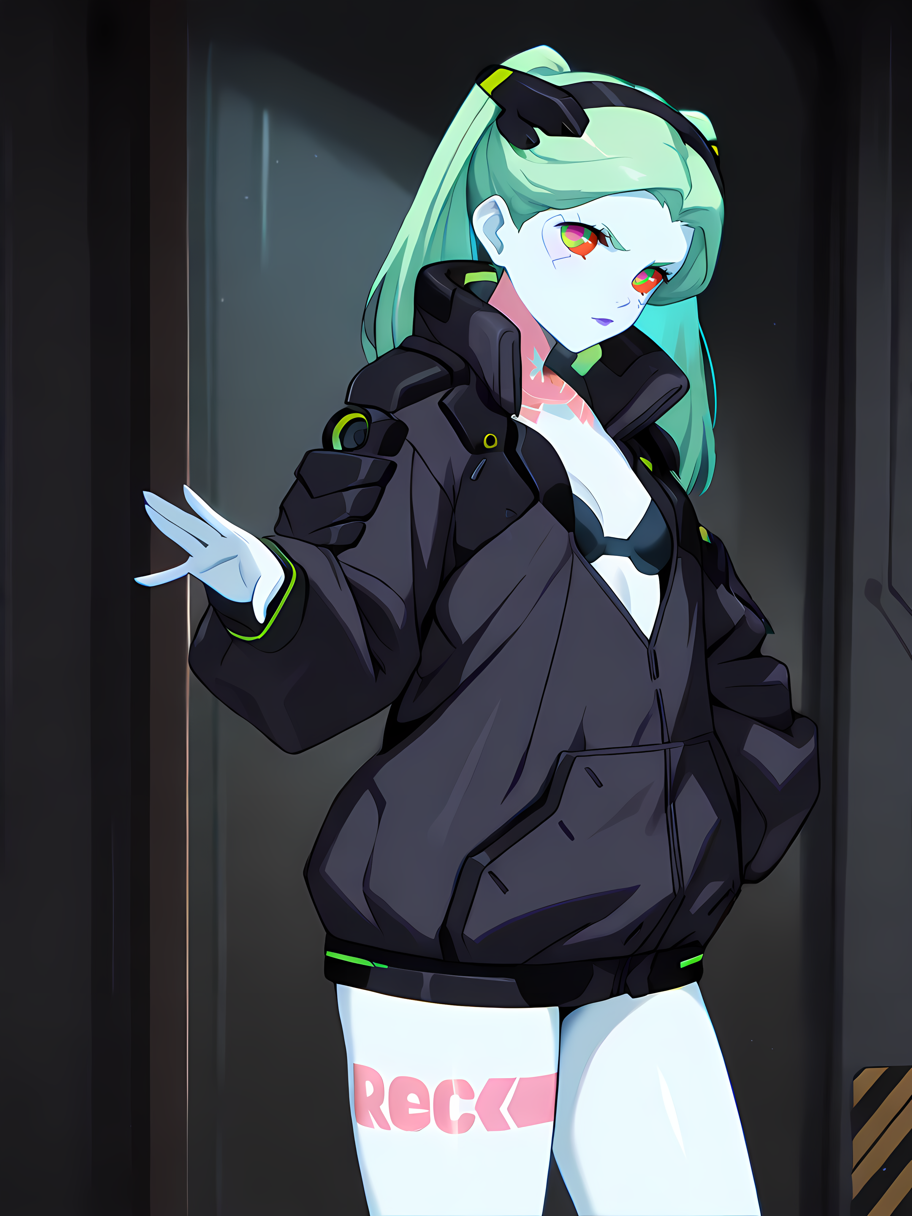 | 训练词汇 | rebecca, green eyes, green hair, colored skin, colored sclera, white skin, red sclera, artificial eye, mechanical eye, cyborg, red pupils,purple lips,makeup, 已复制! rebeccaunder, long hair, straight hair,underwear, black bra, black panties, stomach tattoo, neck tattoo,leg tattoo,已复制! rebeccadress,twintails, underwear, black jacket, tattoo, black hairband, hair ornament,black bra, neck tattoo,,leg tattoo, partially unzipped,已复制! |