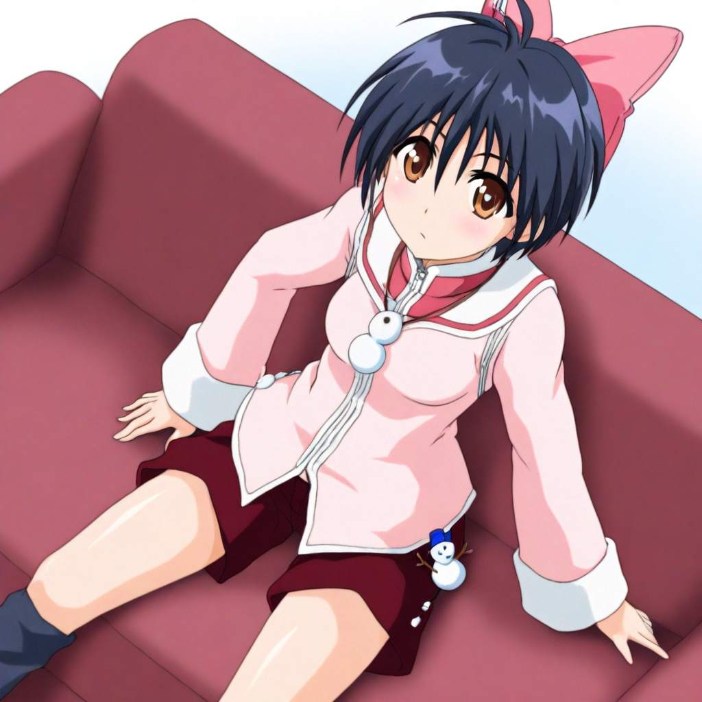 s_mar, black hair, short hair, hair bow, brown eyes, long sleeves, snowman necklace, shorts
