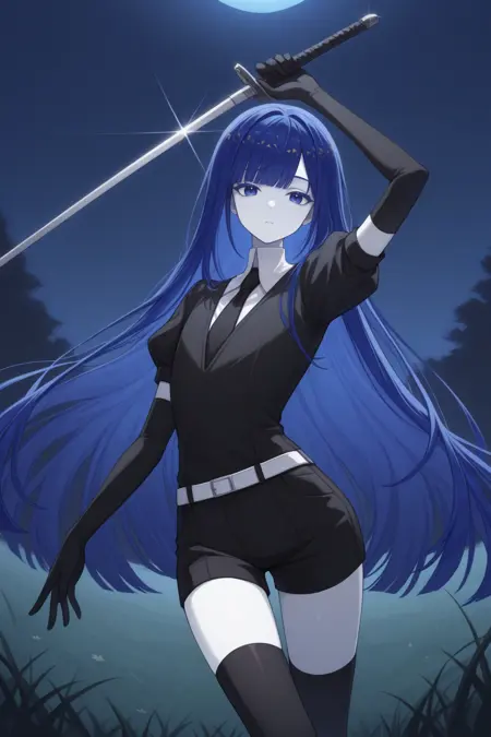 복장: 검은 셔츠, 풍성한 짧은 소매, 날개형 칼라, 검은 넥타이, 흰 벨트, 검은 반바지, 팔꿈치 장갑, 검은 장갑, 검은 허벅지 양말, 검은 신발