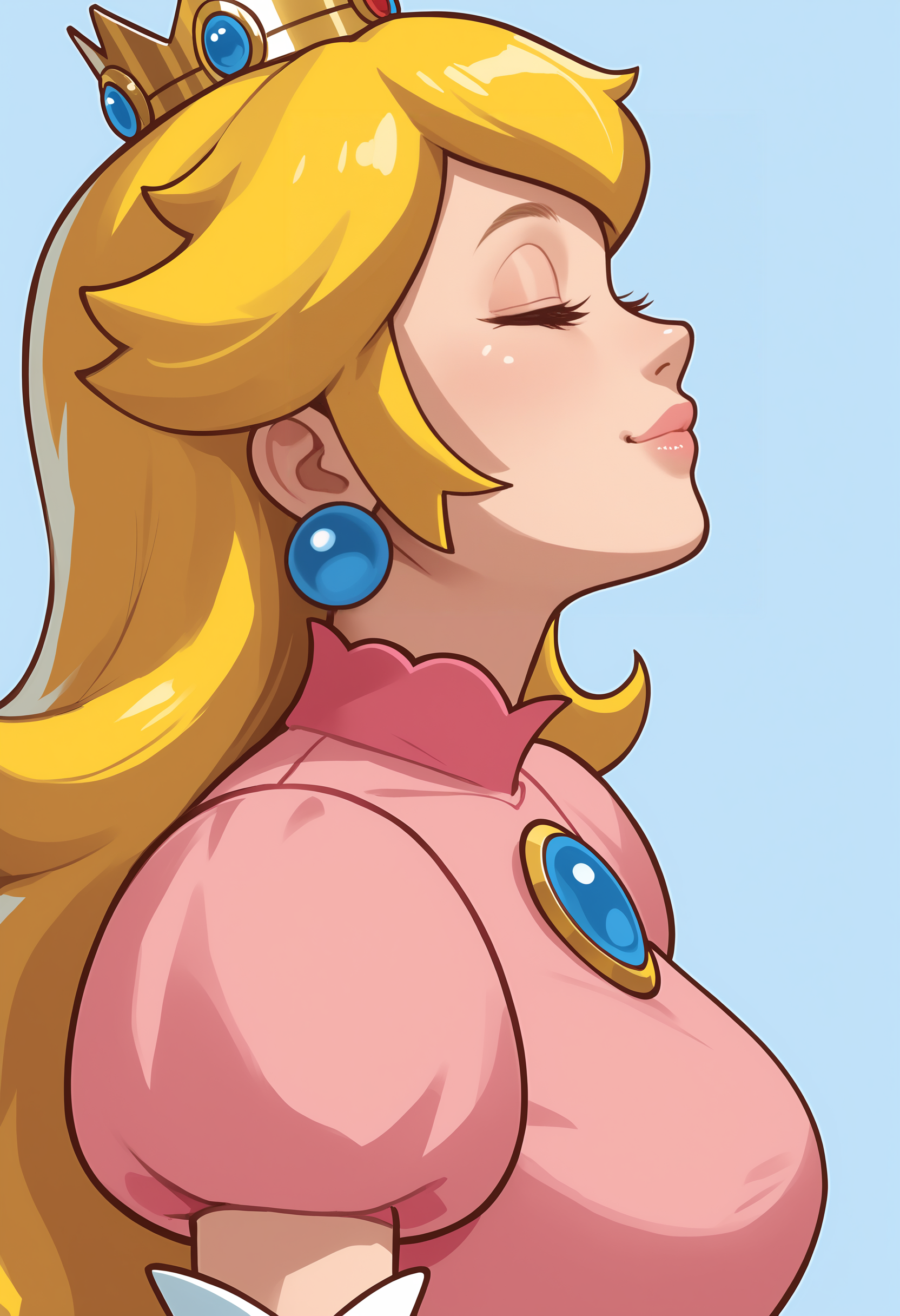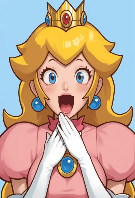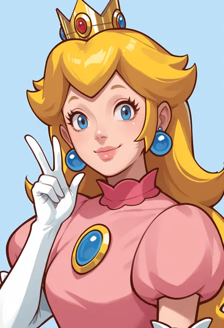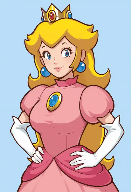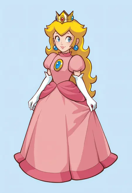 sppeach, blonde hair, long hair, blue eyes, dress, pink dress, crown, earrings, elbow gloves