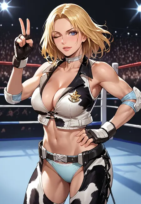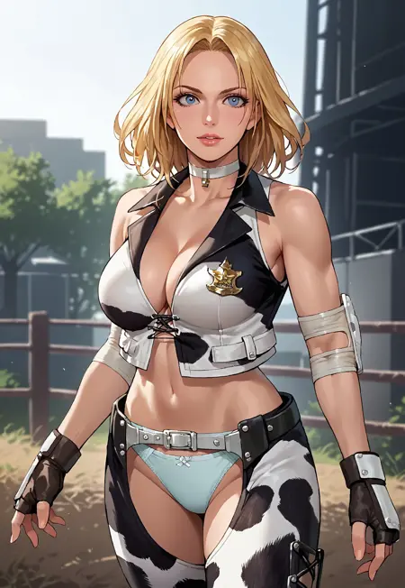 - choker, crop top, cross-laced clothes, cleavage, midriff, chaps, underwear, cow print, cleavage, midriff, badge, elbow pads, fingerless gloves, belt, cowboy boots,