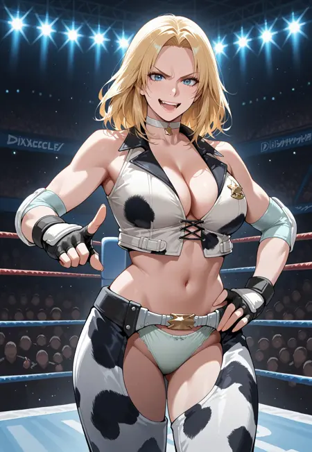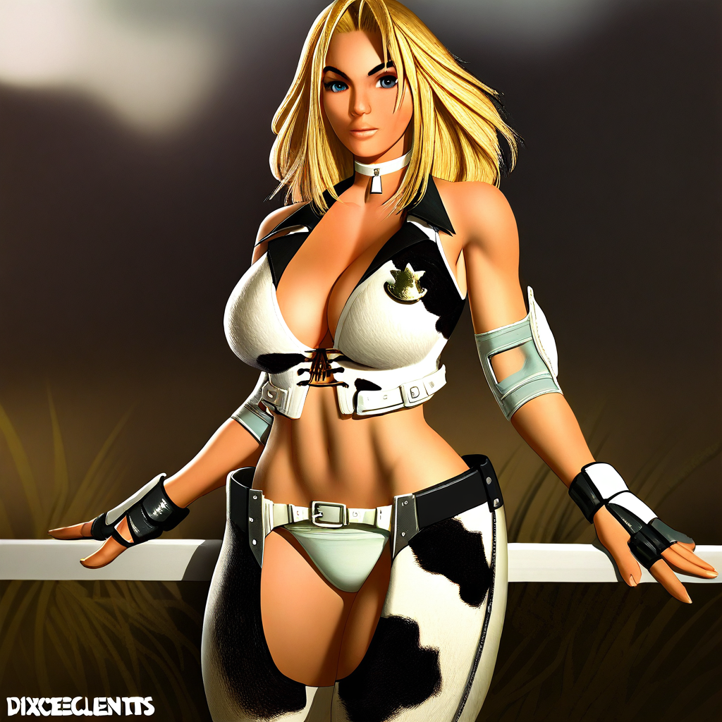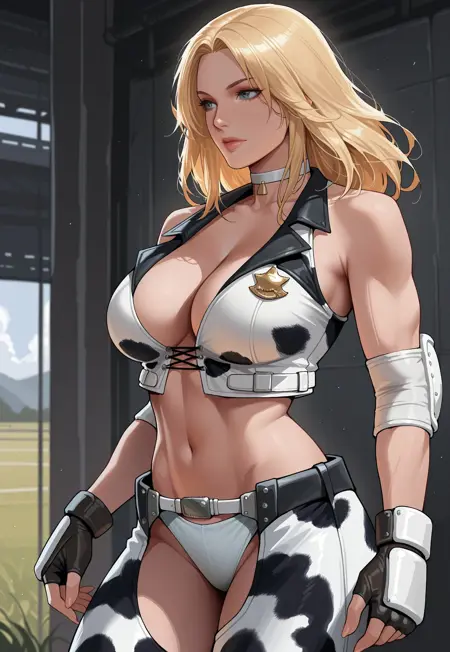 - 项圈、短上衣、交叉系带服饰、乳沟、露腹、马裤、内衣、牛皮花纹、乳沟、露腹、徽章、护肘、露指手套、腰带、牛仔靴