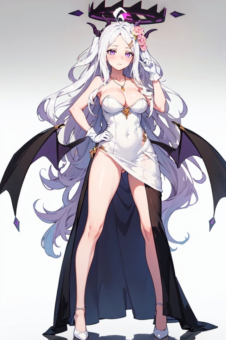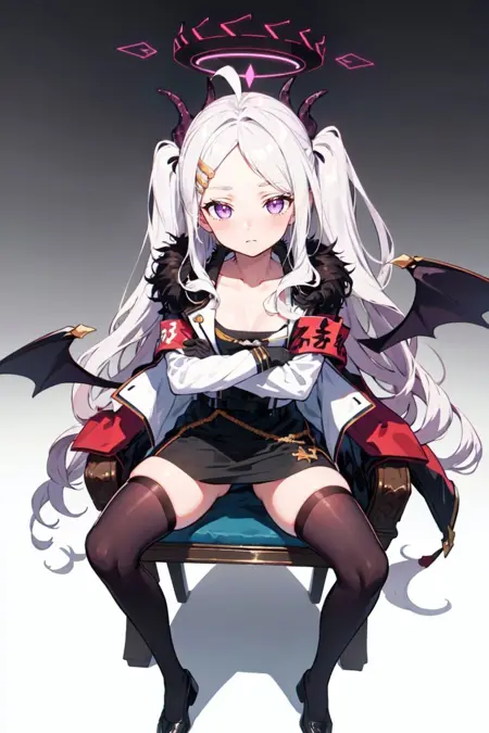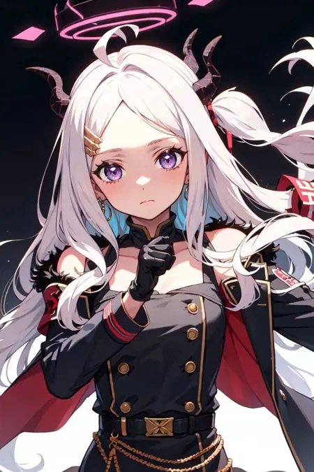 对于她的战斗造型,请使用以下标签:pikkyhina, 1girl, solo, looking at viewer, white hair, long hair, parted bangs, bangs, ahoge, one side up, very long hair, purple eyes, flat chest, breasts, horns, halo, hairclip, collarbone, hair ornament, multiple horns, demon horns, jewelry, coat, skirt, armband, jacket, gloves, black gloves, long sleeves, military uniform, uniform, coat on shoulders, fur trim, fur-trimmed coat