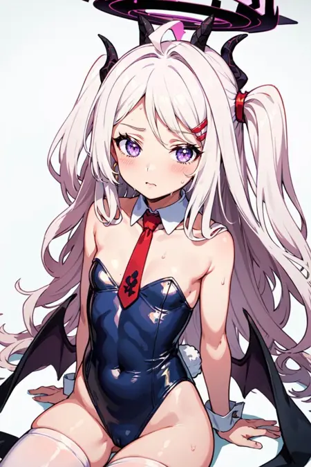 对于她的泳装造型,请使用以下标签:pikkyhina, 1girl, solo, looking at viewer, white hair, long hair, parted bangs, bangs, ahoge, one side up, very long hair, purple eyes, flat chest, breasts, horns, halo, hairclip, collarbone, hair ornament, multiple horns, demon horns, jewelry, swimsuit, wings, innertube, whistle, forehead, sleeveless, sweat, school swimsuit, one-piece swimsuit, low wings, wet, name tag