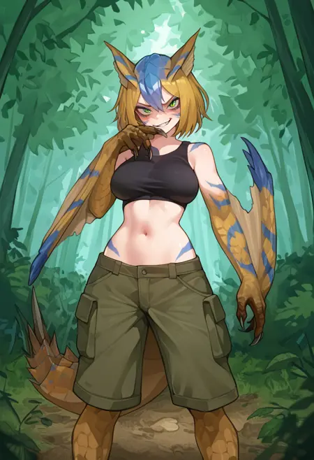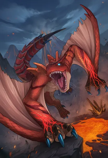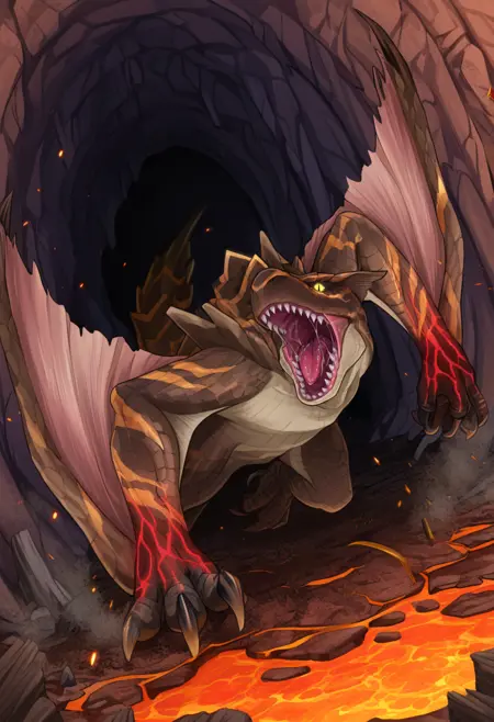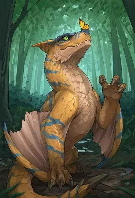 推荐正面提示:tigrex,scalie,翅膀*,带翼手臂*,tigrex翅膀*,尾巴,tigrex尾巴,粗暴型**