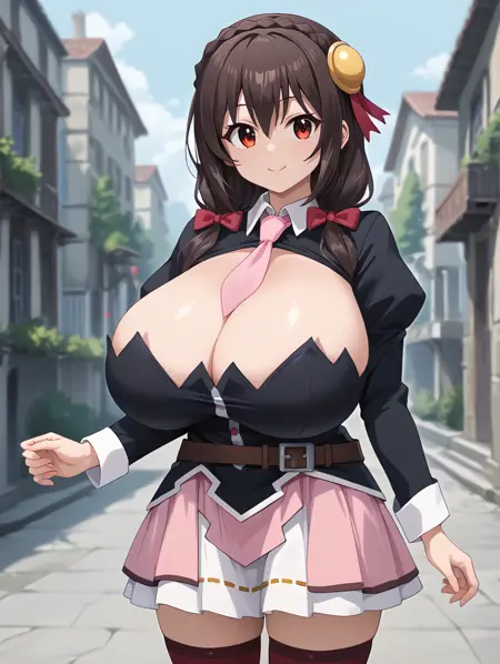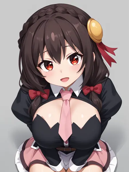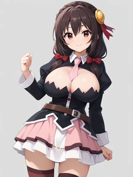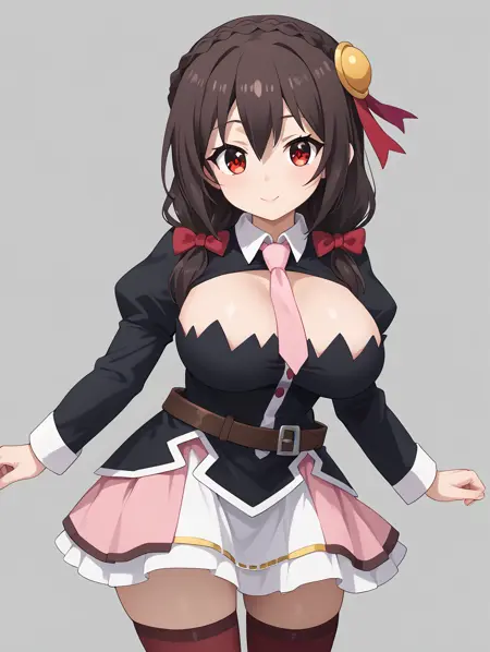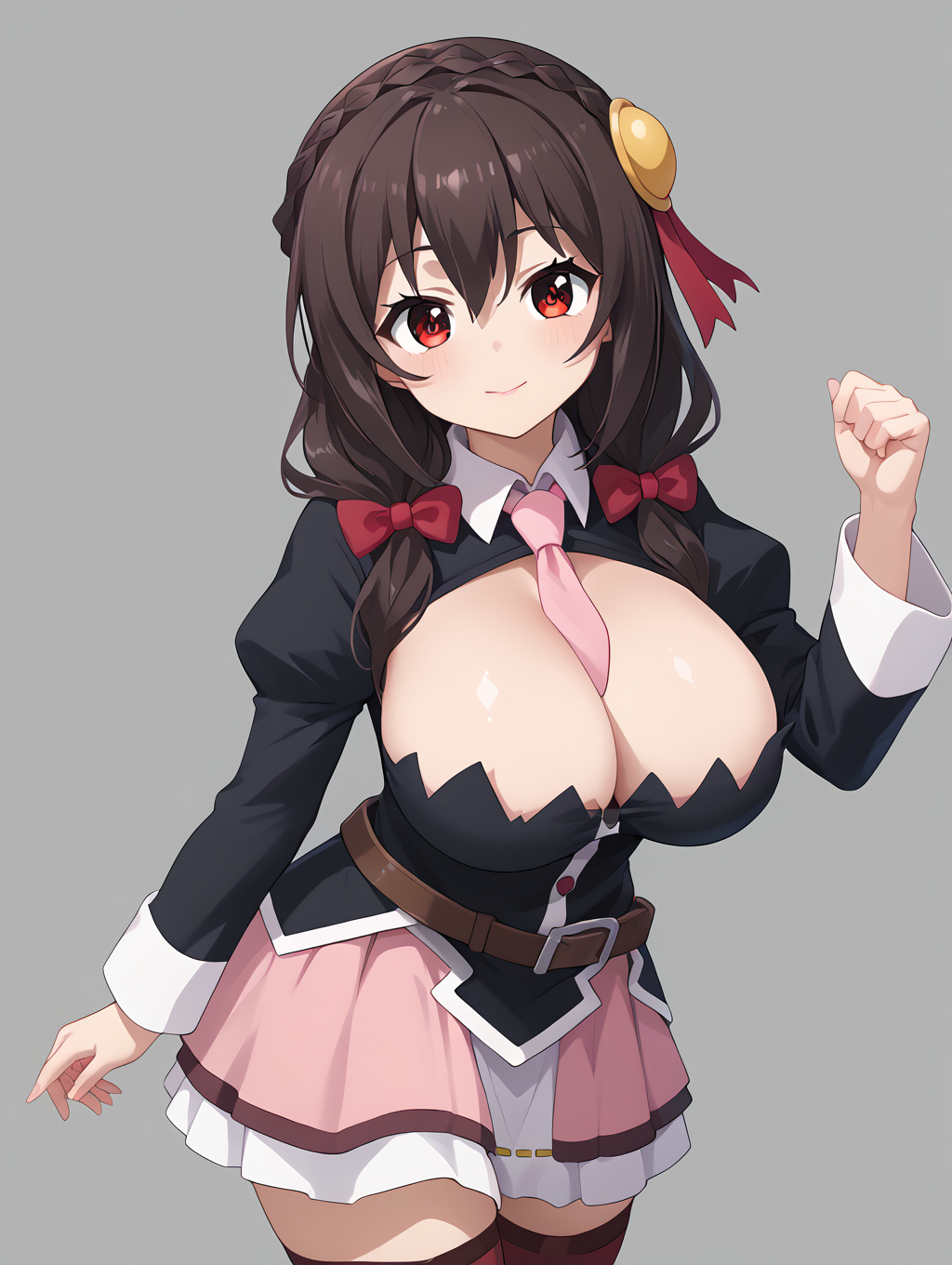 Prompt: 1girl, solo, Yunyun-Liver020, red eyes, brown hair, pink necktie, red thighhighs, long hair, black shirt, large breasts, pink skirt, white skirt, brown hair, black hair, long sleeves, hair ornament, red eyes, thighhighs, bow, ribbon, hair between eyes, twintails, braid, hair bow, pleated skirt, brown boots, puffy sleeves, brown belt, miniskirt, red bow, clothing cutout, cleavage cutout, juliet sleeves, pink skirt, crown braid, white skirt, multicolored skirt