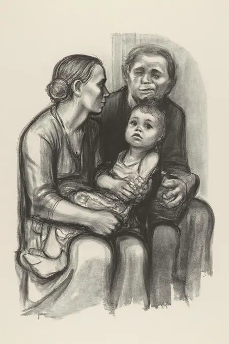 • 母性与苦难:她笔下母亲保护孩子、哀悼家庭的场景成为标志性形象。